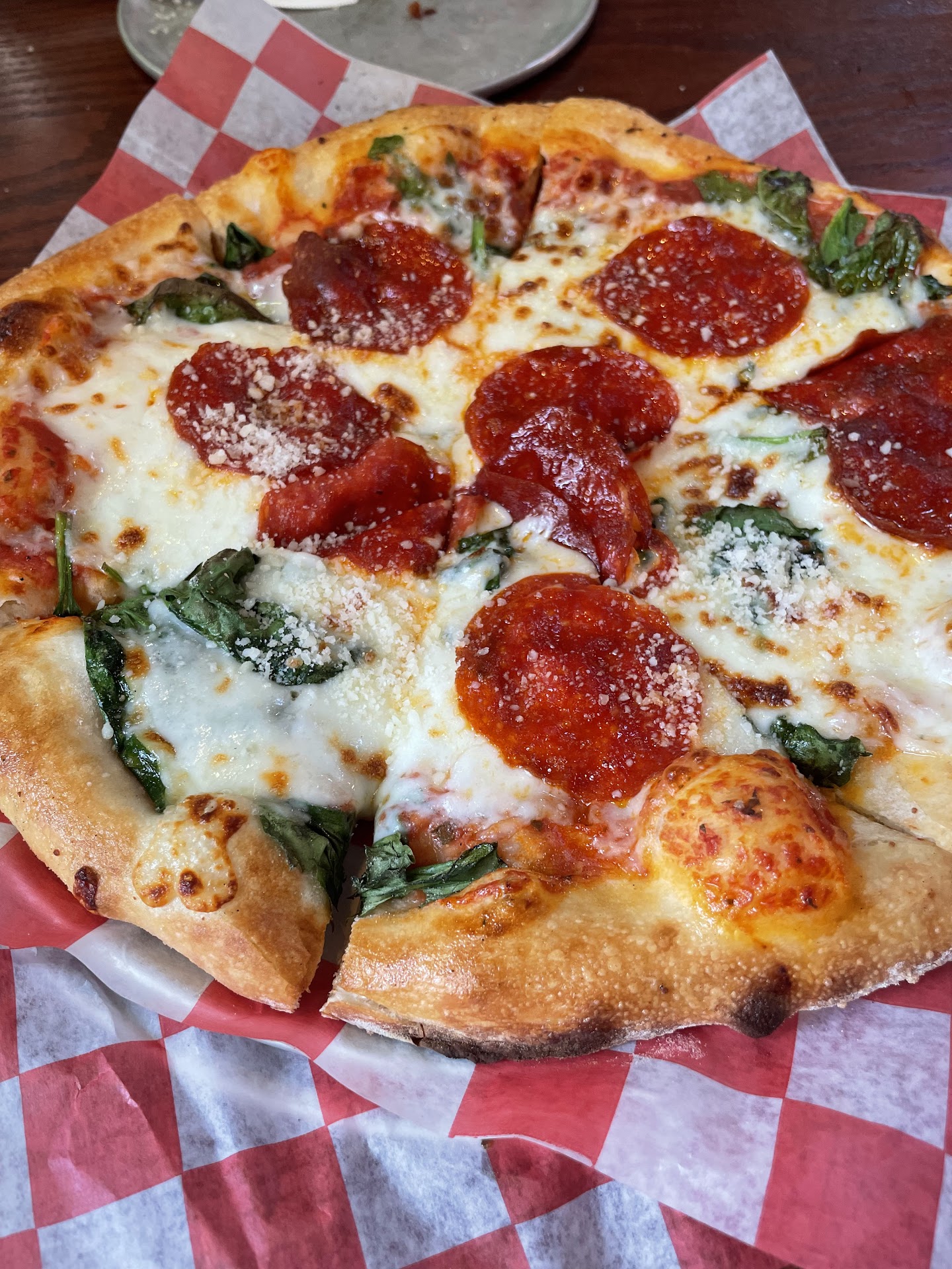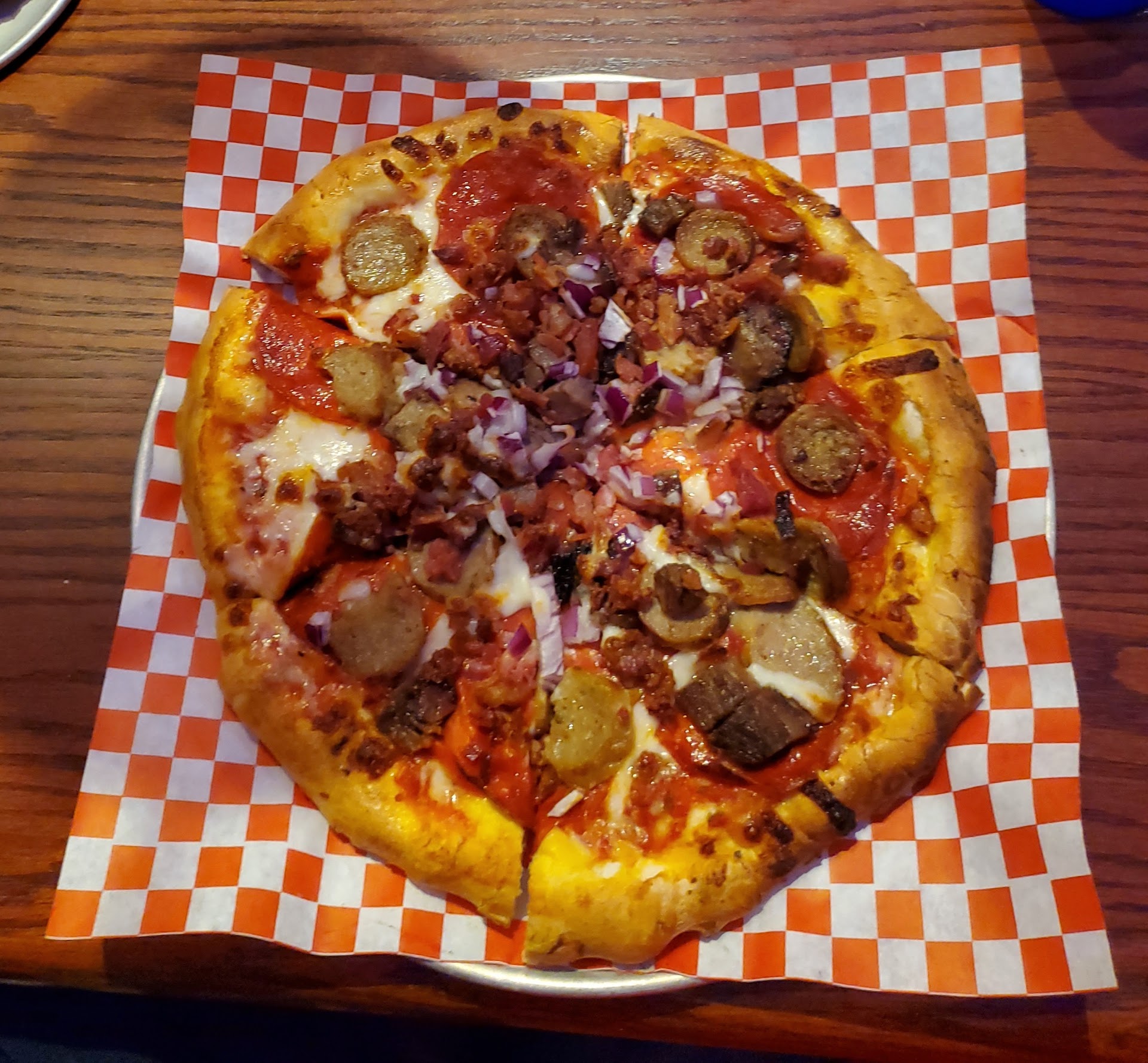 We also tried the Vinnie pizza. This comes with tomato sauce, mozzarella, Blue Door smoked brisket, bacon pepperoni, red onion and Marksbury Farm Italian sausage. The crust is amazing and unique, the amber ale adds a new level to the flavor. The pizza was pretty good all around, however the sausage and brisket were cooked before and when reheating it makes them a little tough and extra greasy, in my opinion. The pepperoni was great, and the bacon was chopped thick.