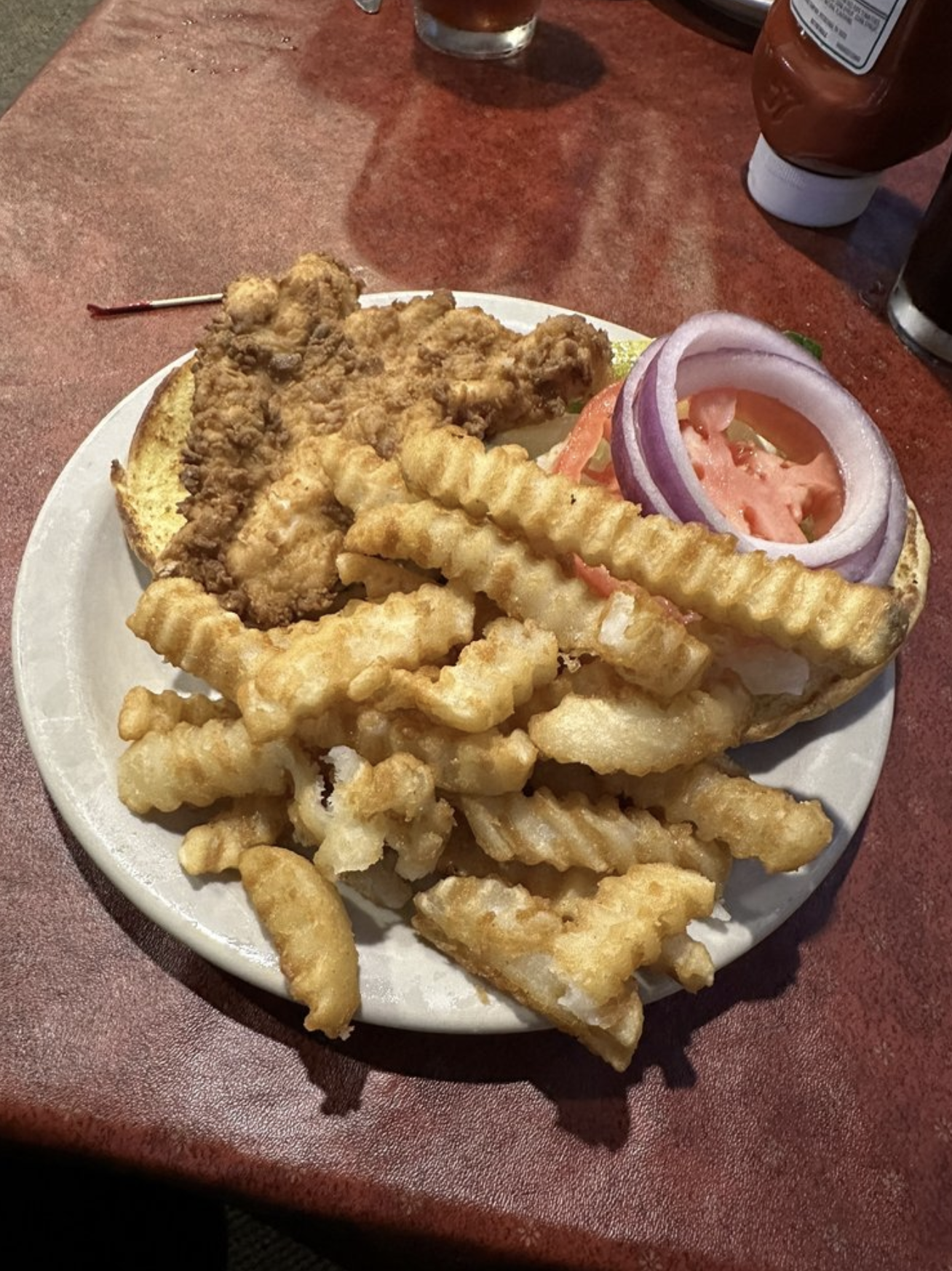 I got the fried chicken sandwich with all the toppings and came with a choice of side, mine was fries. The sandwich was huge and they gave a large amount of fries as well. It was served on an onion bun which I love. The chicken was super moist and soft. Honestly, one of the better chicken sandwiches I've had. You can tell the chefs took time to prepare the chicken and cut off any nasty parts someone might not want to ingest. The fries were the perfect texture. Only thing is I wished it came on a bigger plate because there wasn't a lot of room to move things around, but that's just me being a little picky.