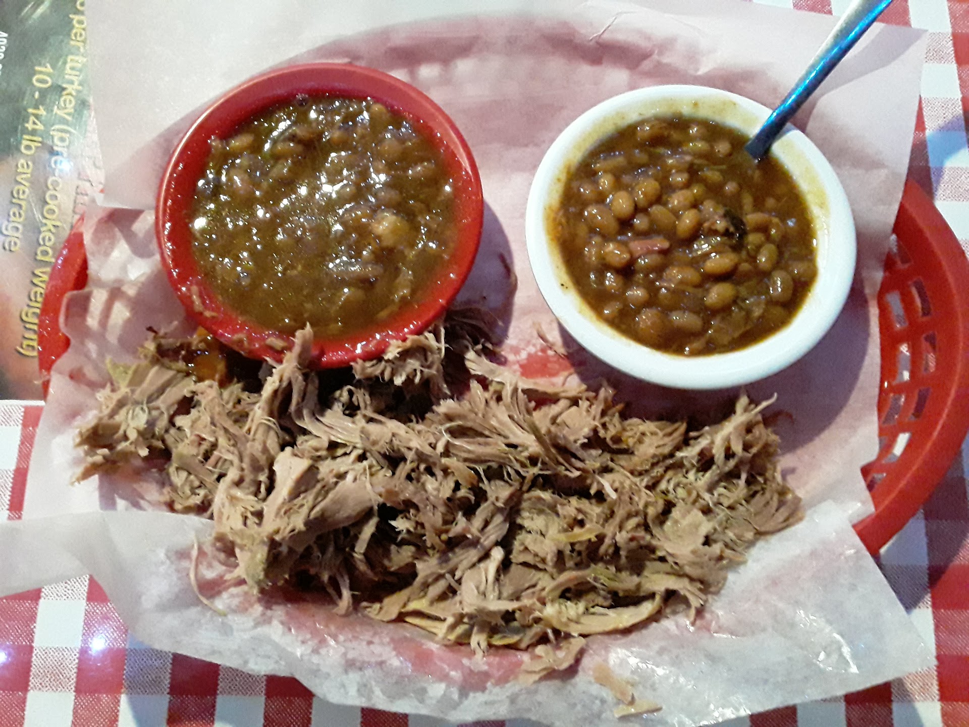 Read moreThis is our second time here. First time we weren't that impressed, but it was ok. This time, definitely not impressed. Not sure what all the hype is all about. Just your average BBQ joint. Hubby got the 1/2 smoked chicken with 2 sides, green beans and baked beans with a corn muffin. The chicken was dry and could not taste the smoke. He said green beans were good, but the baked beans were overly sweet. And the chicken was not hot. I got the pulled pork plate with 2 sides, baked beans with Mac n cheese. The pork was a little dry, and was definitely not hot, actually, it was kind of cold, and I got no smoke taste either on the pork. The Mac n cheese was gloopy. Kind of congealed, if you will. And the beans were sweet, overly sweet, in my opinion. The muffin was good. We also ordered the peach bread pudding. Ate that when we got home, that was pretty good, enjoyed that. So, for me, us, this will be our last meal here. We always give a place two tries, and order different each time. If we didn't enjoy the food the second time either, it's a no go. Like I said, not sure what all the hype is all about. Different tastes for different people, I guess. We will continue our search at the Blue Door for BBQ next time. Too bad. I was hoping it would be good this time....one more thing, I am so tired of the tip thing. The young lady at the front counter never said hello or thank you. They call your name so you have to pick up your plate, no thanks, not even a smile, and you must dispose of your own garbage, why should I tip? But that has nothing to do with my review about this place, it is based solely...