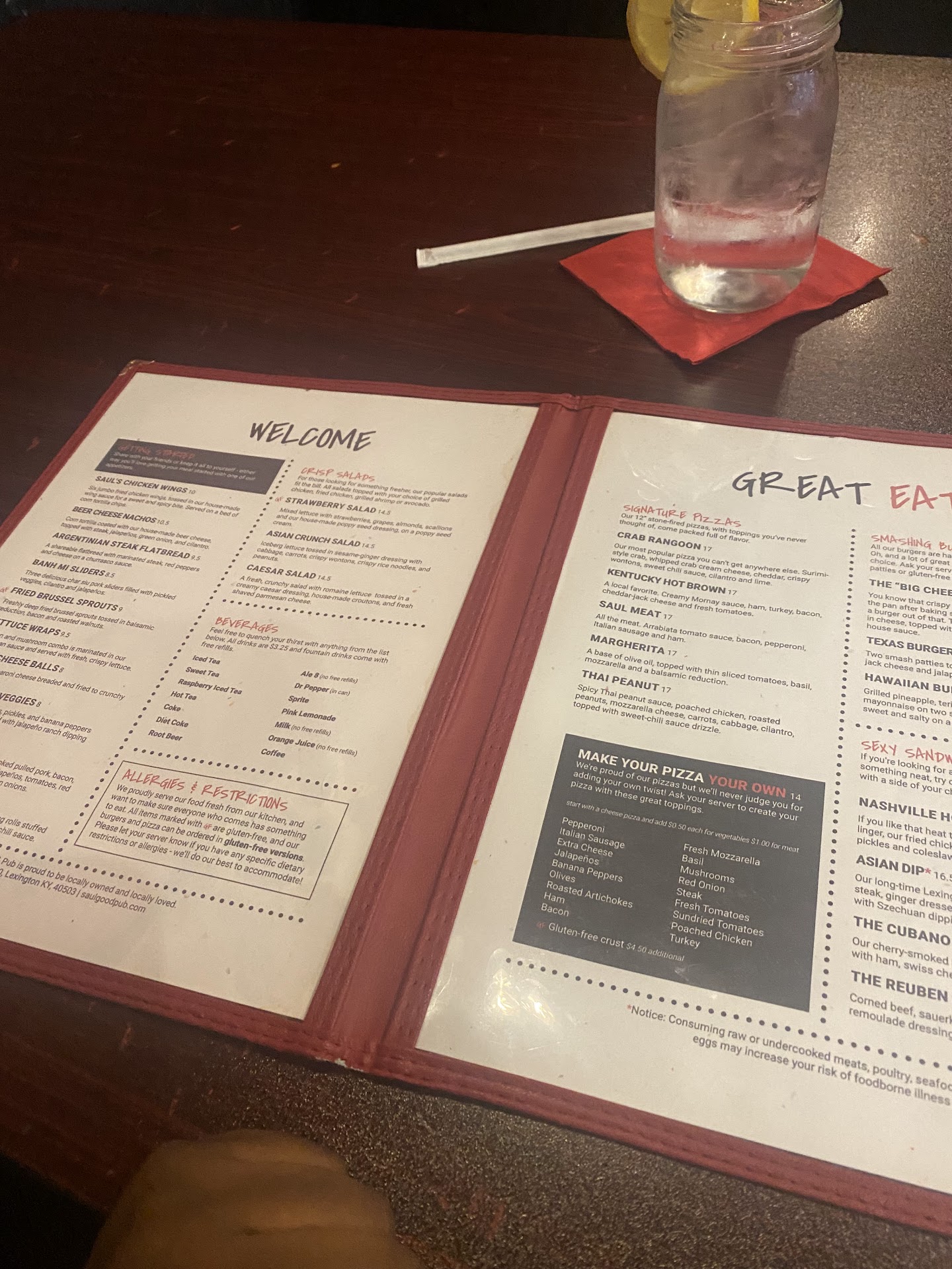 Read moreHi all👋! As some of you may know, I am a medical traveler, currently assigned here in Lexington,KY, and I really like checking out local eateries, stores and coffee shops as I travel along on my journeys! So I'm going to tell you of my experience at Saul Good Pub here in Lexington on Saturday 2/27/21! So once again I went with a fellow traveler from work and had a very Nice and Relaxing experience! As is customary now a days, mask are required and the spacing of tables made it comfortable to talk and walk without bumping into someone from another table. Our server was Nathan and he was truly what we all want our servers to be(friendly, knowledgeable and attentive but not overly so)!! So this restaurant has the smart phone scan thing that lets you pull up the menu on your phone(also have printed menus if it does not work)! Our Appetizer was the Buffalo Chicken with ranch and celery!! We both ordered the Cajun Chicken Pasta and I ordered the White Chocolate Cheesecake to go! Yall, this was Fan-freaking-tastic!!! The portion was enough to eat there and take home! The price point was moderate! The style was casual dinning! Also had a Nice mix of music playing(but not to loud)! Nice layout and flow! Very very nice experience due in part to Great service by Nathan and the comfort of the restaurant itself(we stayed past closing and they didn't kick us out) 👍👍!! Think I may Go back this weekend too!!...