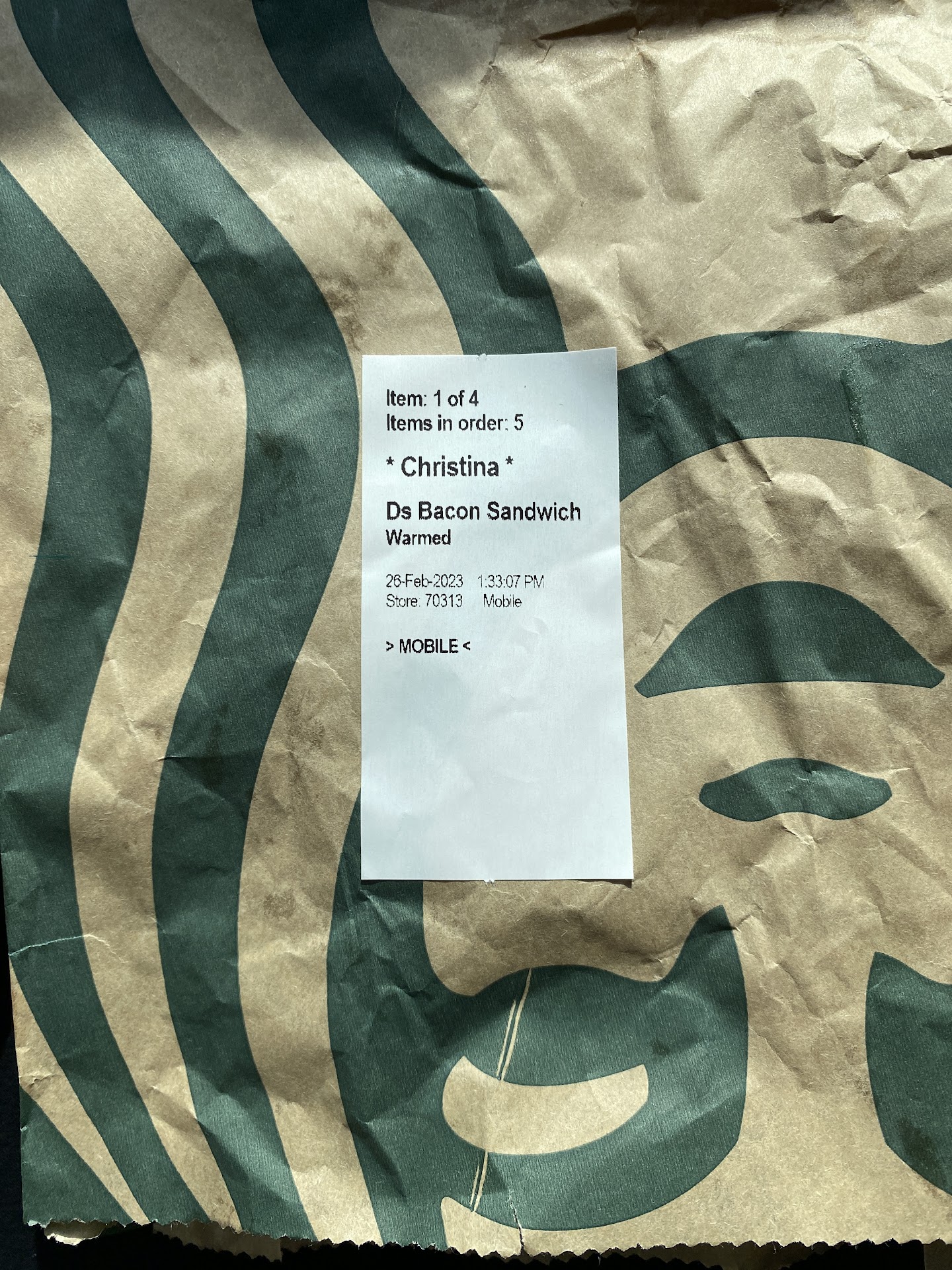 My reason for choosing Starbucks started because of quality, but that hasn’t been my experience with this location, especially my last visit, one of the the items in my order was missing, and I didn’t realize it until leaving, after coming back in to explain I was told that they had ran out, but they could make another, so why didn’t I get some kind of notification, or at least offered verbally when I came to pickup the order, I thanked her when I did pick it up, seems like a good opportunity! Also, I had 4 food item's, and dropped one that slid, I should’ve been given a bag! There was no ownership/empathy on the Barista’s behalf! I have also noticed that the price of the double smoked bacon breakfast sandwich changes on some days, from five dollars & some change to eight dollars & some change, and that doesn’t feel right. Needless to say, I have takeaways from...