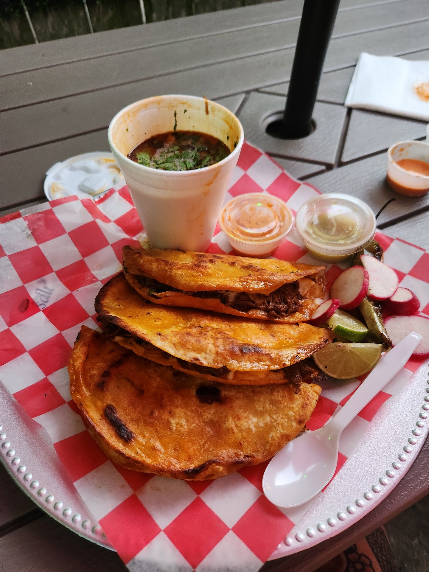 Read moreFirst time here - (picky eater & hard to please, as I love cooking myself) OMG, best birria EVER. I'll probably never go anywhere else. Its tender, juicy, and just right, the size is a huge plus too, ordered 3 because they're usually small, I got to eat 1 later in the night (thank God bc DELICIOUS). Its a taco truck, so car ordering (great to avoid sickness & germs). They barely speak english but honey that means the food is going to be IT, and it was!!!! Gracias...