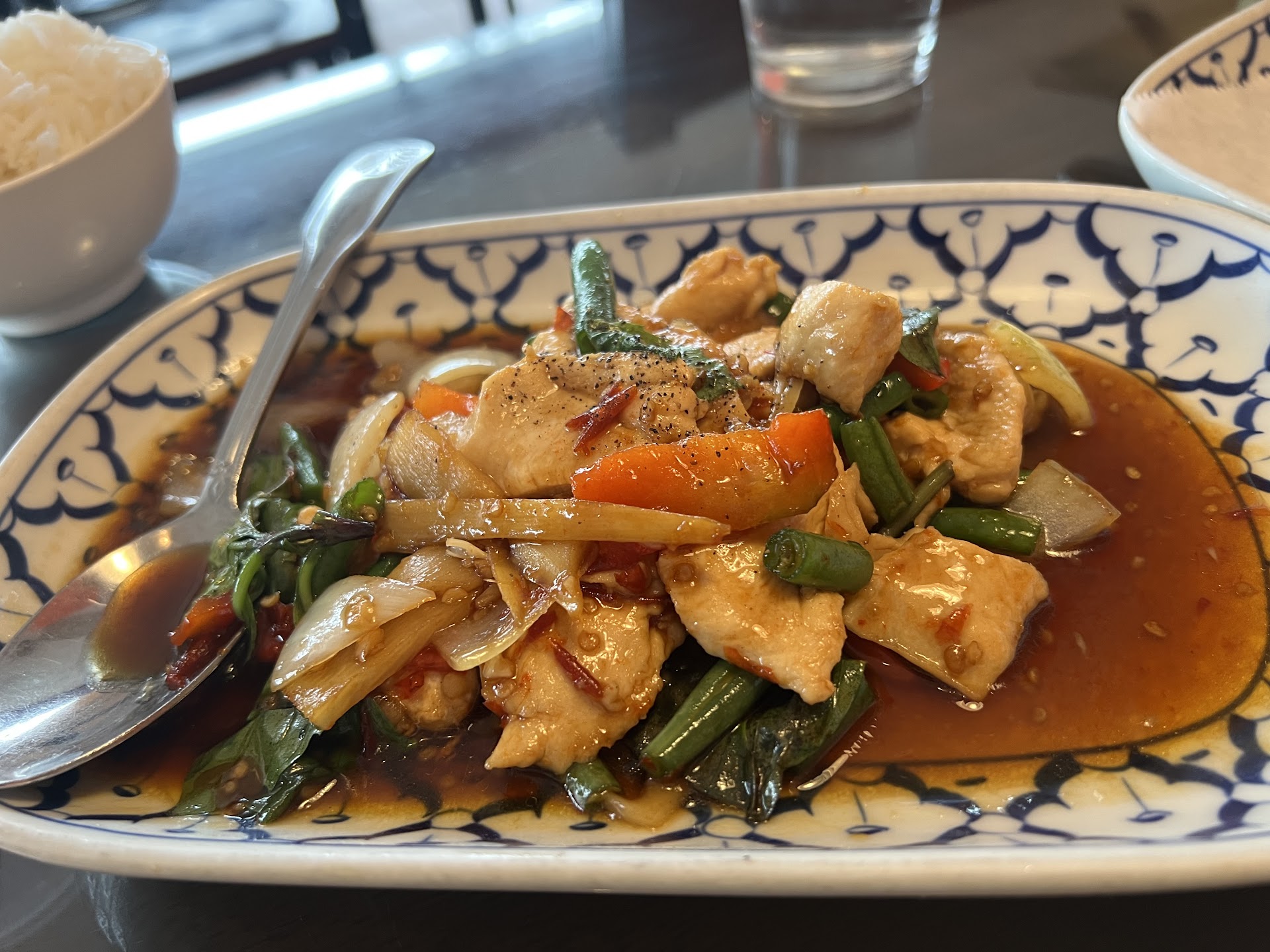 Read moreMy daughter and I were craving Pad Kee Mao (Drunken Noodles) after I picked her up from school, but most places are closed between 2-5PM. This one was open! Glad we tried it. The restaurant was very clean, beautifully decorated, with extremely reflective wooden tabletops. Our waitress was a beautiful woman who was very inviting and friendly. She brought us 2 Thai Iced teas, and some crispy coconut shrimp served with a very light cilantro aioli. The iced teas were reasonably priced; most places ask $4.50 or $5 for one glass, this place charges $2.50. The whole menu looked delicious. We ordered pad kee mao (chicken) and green curry (veggie). They use real Thai curry paste made with ground chilies so be aware that even if you order your curry mild, it will still have some heat. My green curry came with white rice. The veggies in the curry were broccoli, red bell pepper, green bean, bamboo shoots, onion, in a green chili coconut milk curry sauce. My daughter usually nibbles at her food and gets bored of eating, but with her plate of drunken noodles she ate almost all of it. We sat for a long time sharing and savoring the food. The waitress was so sweet to my daughter and offered her a few candies after we closed the bill which came to $44 for 2 drinks, an appetizer, and 2 entrees and tax. Overall this place has good food and...