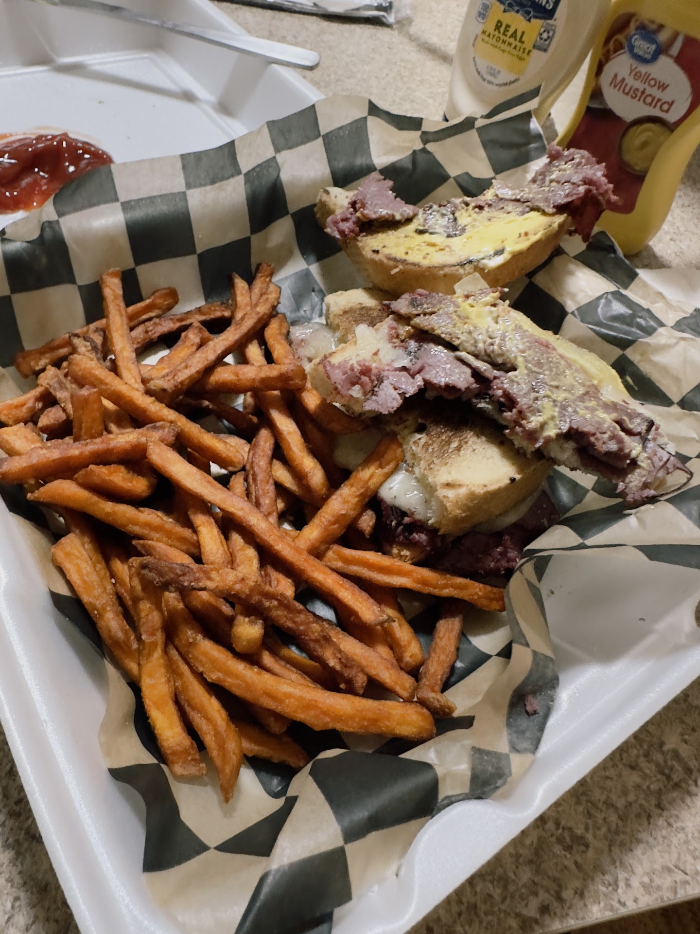 I ordered carry out so my star ratings for the service and atmosphere are based off limited exposure but the place seems nice and the staff were attentive and quick to take care of me. Very nice people. The problem with my experience was the food. I got the pastrami sandwich with sweet potato fries. It’s so frustrating because the bones of this food were really good and I feel like it could have been a great meal had it been done correctly. First off, the sandwich was missing half the ingredients, no slaw or thousand island dressing. The pastrami was pretty dry which was made worse because it was missing the above mentioned ingredients. The bread was tough around the edges as well. The fries tasted good but they were not fresh at all. Cold and stale but even with that they still tasted good. I can only imagine how good this sandwich would be if done fresh and with all the correct components. Just very disappointed in what could be a fantastic meal if more attention to detail and care had been given. Debating on whether to give this place a second chance. This was not a cheap...