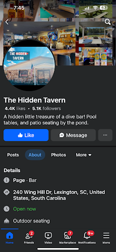 Ā Ā Ā Read moreA great little dive bar experience, convenient to Lexington yet just out of the grasp of the Town of Lexington's Finest. Formerly JT's on the pond, The Hidden Tavern's aptly named bar is just that. A hidden gem with a gorgeous water side view. A warning, this a private bar with no dining, so you will need a membership or someone to sign you in as a guest. This is normally easy as there are smokers outside or patrons surrounding a fire by the firepit. Also, cash only, so no credit cards. ATM on is site, but you know how pricey bar ATM's can be. Would love for this place to have some investments made to make it better. Perhaps Biker friendly parking (currently gravel), some great shareable food options, more TV's and of course take credit cards. The bar staff on the night I visited, was just one, however she was the nicest and very friendly. Drinks were poured heavy but not too heavy. Drink prices...