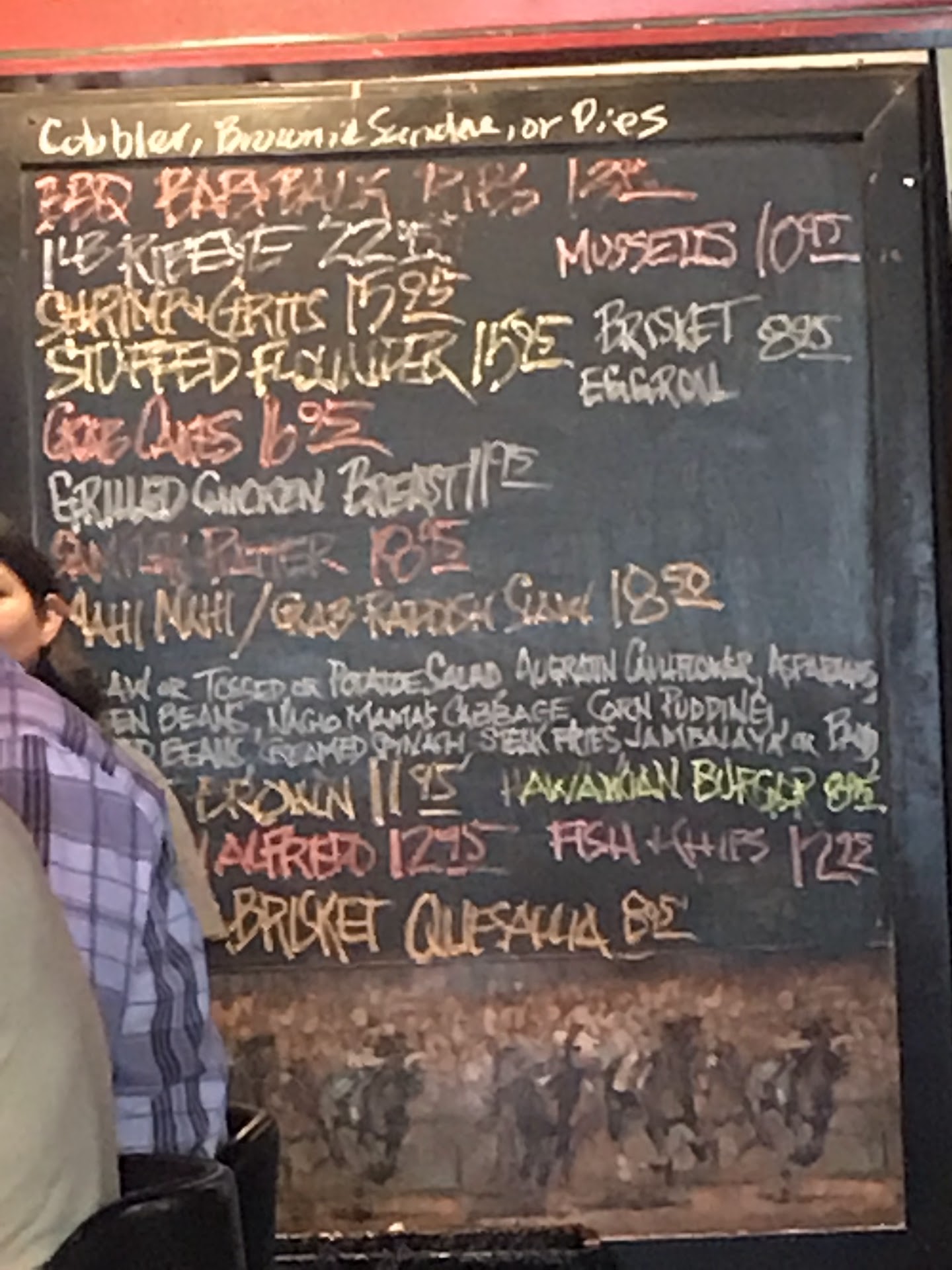 The specials change daily and consist of old fashioned southern comfort food. This is the only place I know that serves home fries, fried balogna sandwiches and knows how to make a Pittsburg rare steak. The regular menu is typical bar food of sandwiches with a side, seasonal soups, or the standard meat with two veg.