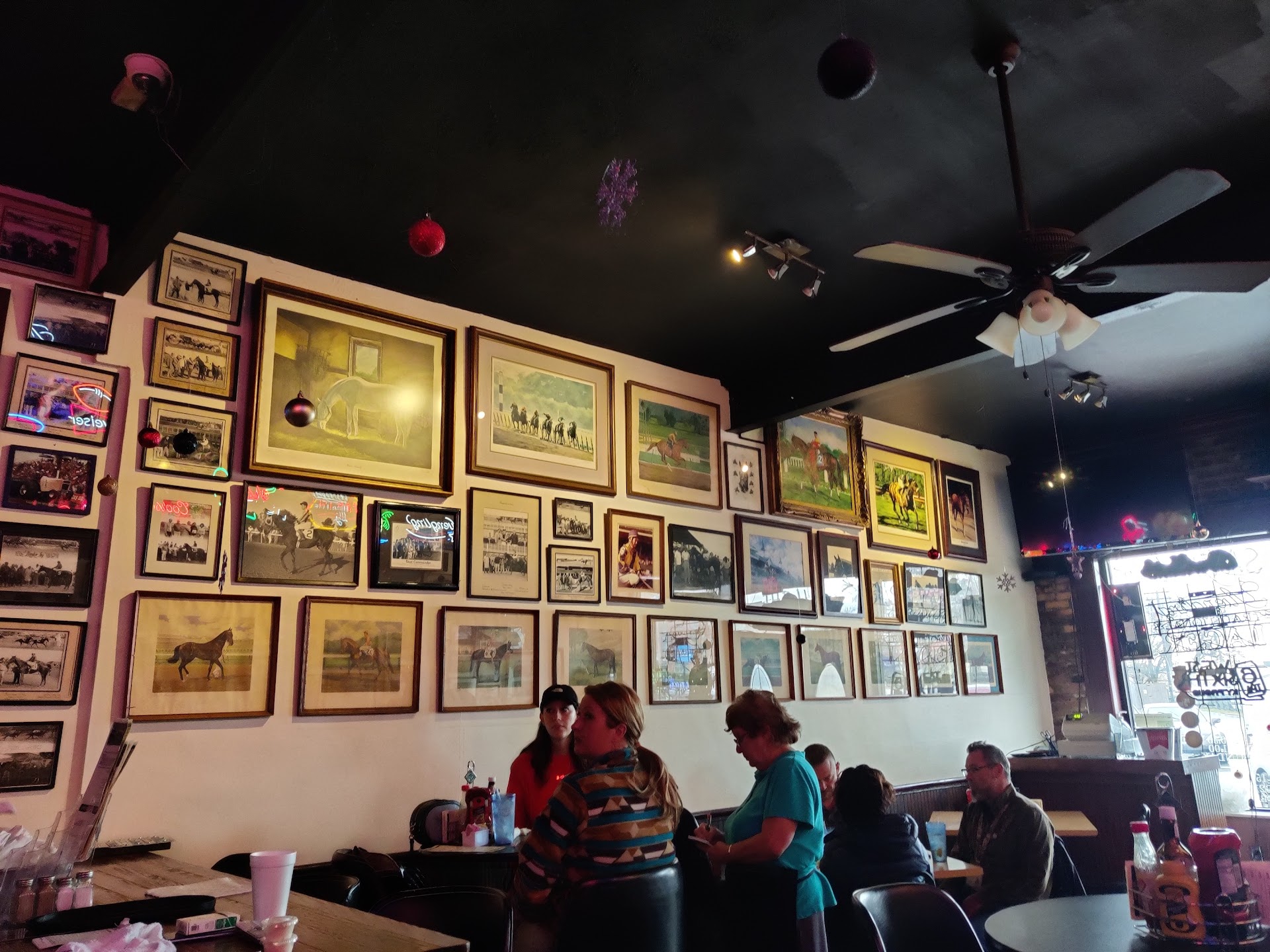 The room is narrow and dark; the walls are covered with ancient horse racing memorabilia. In the winter it is a just a little too cold and in the summer it is a few degrees too warm. It is small enough to be your own personal version of Cheers, where everybody knows your namd but it is not big enough to justify more wait staff so sometimes they get overwhelmed and you might have to wait a few minutes. Still, I love this place...