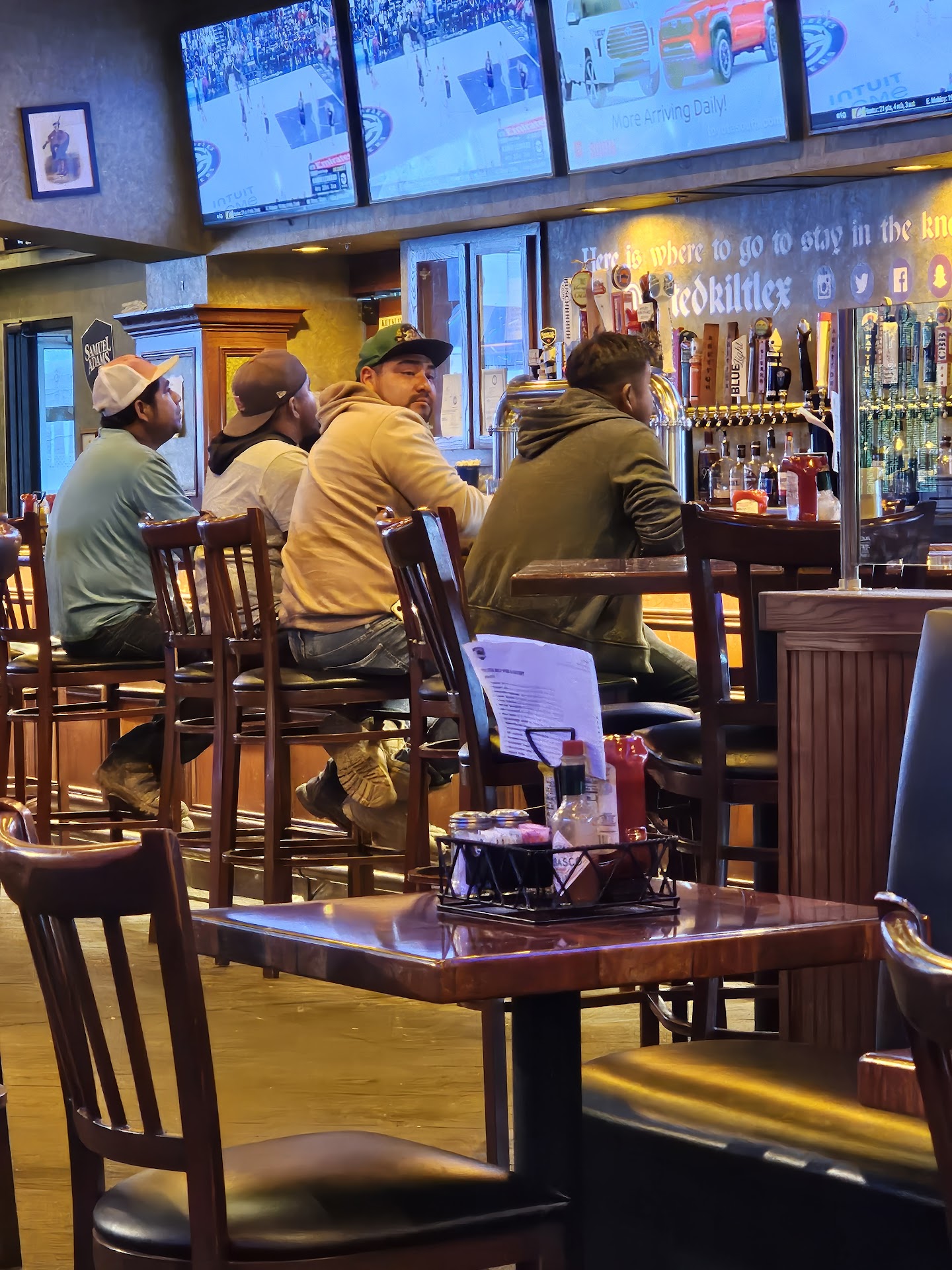 This was my first time at a tilted kilt. We were visiting lexington and decided to try it out. The atmosphere was great, a little loud due to football games but not overly so or unexpected. Our waitress was great; she was on top of everything, checked on us regularly, ensured we were taken care of. However, the night started with us ordering food. Husband ordered a burger and I ordered fish and chips, as wed been told they were really good. He got his burger and that was when I was informed that they were out of fish and chips. The kitchen didnt inform the waitress when she placed the order, only when she went to collect that they had sold out. So I then ordered a burger. While waiting for my burger the table behind us had an issue. The woman had informed the waitress she was allergic to mushrooms and ordered her meal without them. However, after she took a bite of her food she discovered that it had mushrooms. I then listened to her begin having trouble breathing as she looked for her epi pen. The waitress was extremely apologetic and got the manager. I watched the manager go into the kitchen after speaking with her before coming to speak with the customer. When he did his response was not concern for her. His response was to apologize and say that he would comp her meal and then say the waitress had rung it in properly but the kitchen had messed it up. He did not one ask if she was okay or if she needed help or an ambulance or anything of the sort. He then walked away. The man with her went and spoke to the manager before joining her as she went to the car in order to go to the hospital as her breathing was getting worse with her reaction to the mushrooms. I felt this was a wholely inappropriate response by management due to the nature of the incident. It wasn't just an order that was wrong; it was an allergy that wasn't correctly paid attention to that then caused harm to the patron. It was honestly an unacceptable response. I then received my burger. I took a couple bites before realizing that the center of my burger was raw as the kitchen had rushed it out due to the earlier fish and chips incident. Overall I was severely disappointed with my experience here. Due to both the food and the management. The only positive was the atmosphere of the restaurant itself and the amazing waitress we had who did her best with the seemingly limited support she had with both the kitchen...