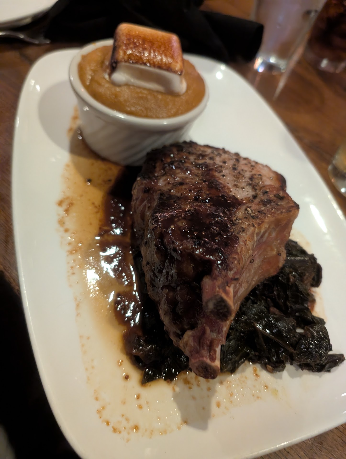 For the main course, I had the dry-aged pork chop. The meat itself was cooked perfectly and tasted delicious, but the side of whipped sweet potatoes with marshmallows was a questionable choice. The combination was overwhelmingly sweet, more like a dessert than a side dish. While I understand the idea of pairing pork with something sweet, this was far from subtle—it felt like two unrelated dishes forced onto one plate.