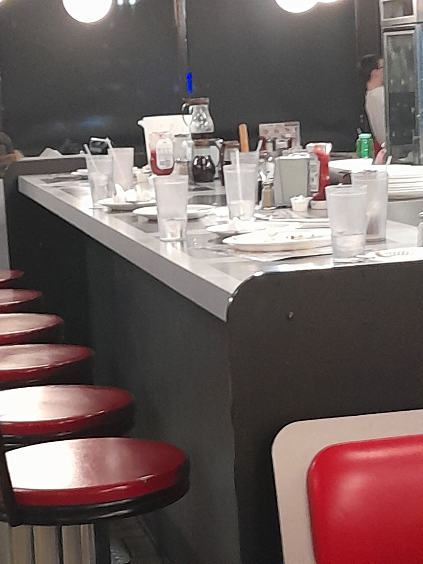 We didn't get out drinks until after everyone had finished/almost finished their food. MOST of the food came out quickly, however, most of us didn't recieve half of out food until we had almost finished eating. (How does that even happen?) They took our order, however, the manager assigned someone brand new to us (I'm all about training rookies but assigning them to a group of five when even the most experienced of waiters have gotten our orders wrong?) and she was okay, however, the manager and the cooks spent the entire time disregarding her ticket that she drew up for our order and was constantly running up to us to ask about our orders. It was absolute chaos. (My brother didn't even get his order until I was half-way done with mine. Not to mention the fact that my mothers sausage sat on the counter for seven minutes because they never brought it to her.) Also, from the moment we walked in to the moment we walked out, the entire table with the barstools was covered in dishes and trash. I have seen less workers with and entire diner packed full be more coordinated and organizes than that.