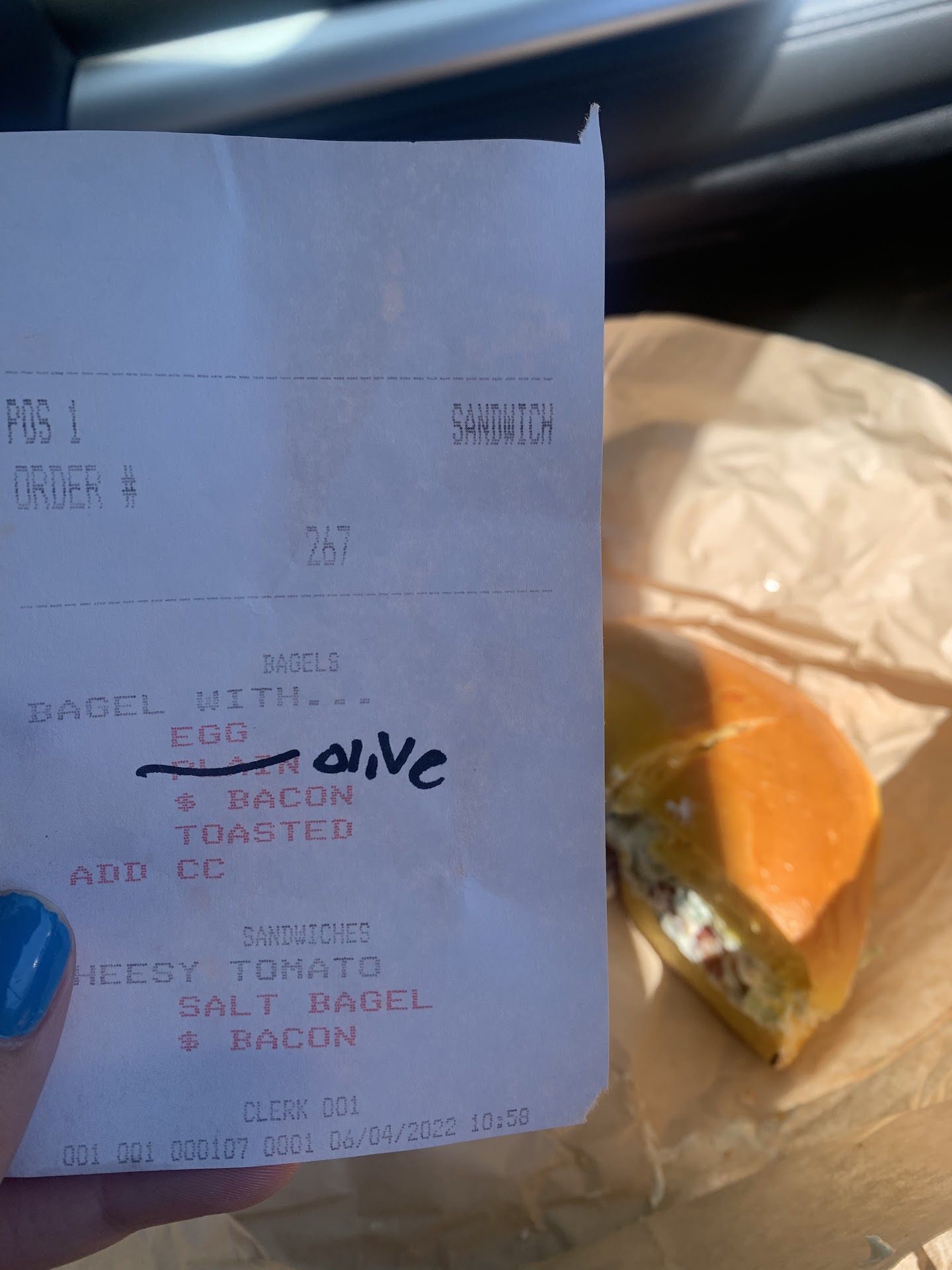 Read moreSad to say this because I actually love this place…we’ll, “loved”. My last 5 experiences there have been extremely frustrating and today was the icing on the cake. After explicitly (and very patiently) explaining my order to the girl working the counter, I spent an additional minute going back over my order (only two bagels )to make sure the bacon was added to both and the cheese made it in my bagel. Finally it seemed like she understood so I paid and was given my receipt. The information read: 1 egg bagel with plain cream cheese. I ordered an egg bagel with olive cream cheese and cheddar and bacon. My husband asked for the tomato cheese meld add bacon. So I went back to the counter and asked for her to correct the ticket that we just spent 5 minutes Over. The lines is progressively lengthening through all this.