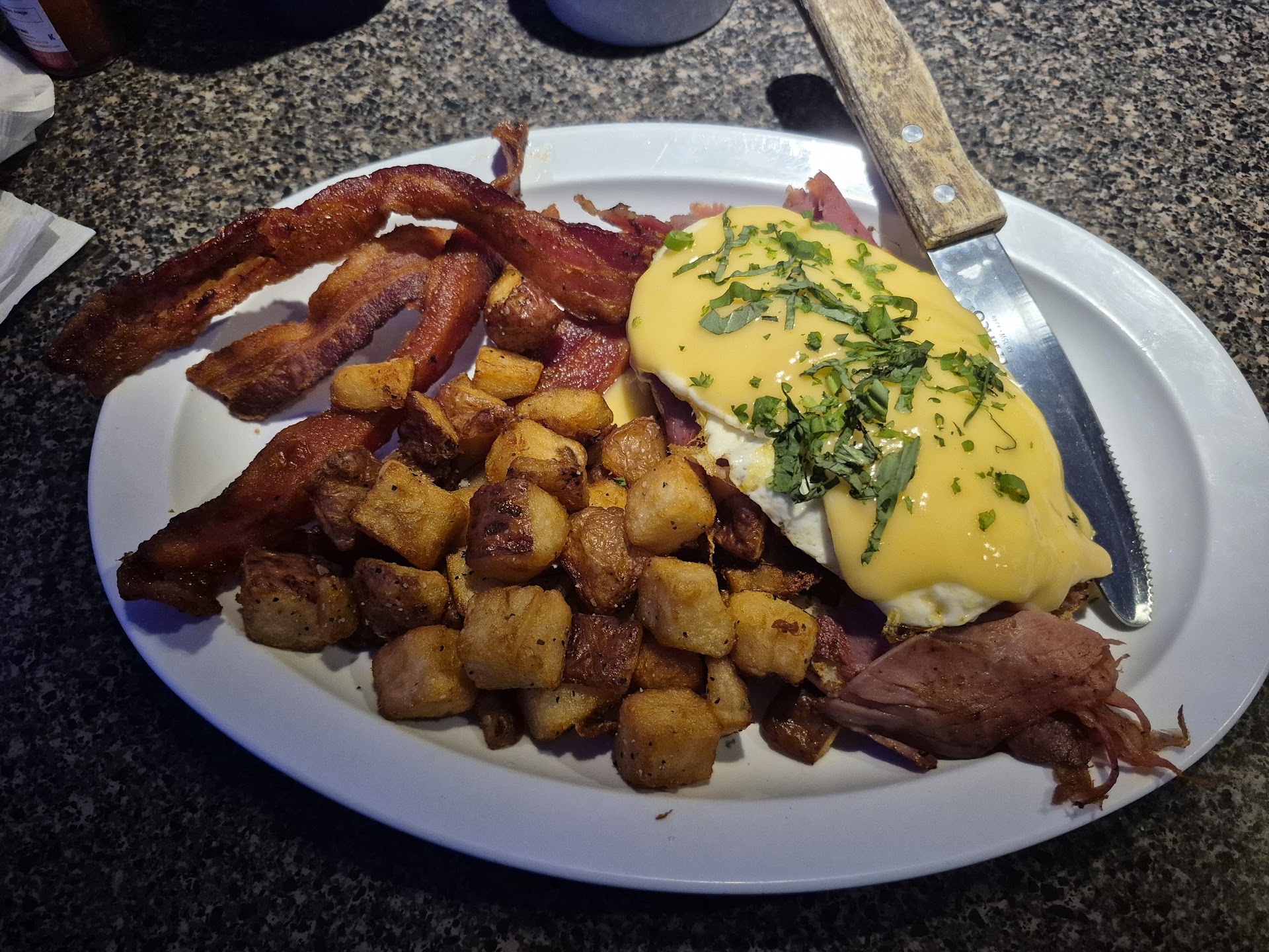 Two things I would recommend: (1) the potato in the home fries should be of more consistent size. The larger pieces were under done and the smaller pieces over done. It looks cool, but so does dashing consistently cut pieces with a little parsley.