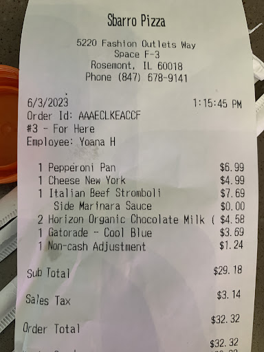 Read moreMany years ago I'd hit a Sbarro in downtown Chicago for lunch now and then. It was always very busy so the slices were always fresh. I ordered a slice of NY cheese and a slice of NY sausage because I saw the $5 off on the first order on Grubhub. I also tried the garlic bread, which for more than $2 was not worth it. Not really garlic bread in the usual sense. It was a soft tiny loaf that was lightly brushed with garlic and butter. Both slices seemed to have sat around for hours. Almost no flavor on the cheese slice and the sausage slice was only slightly better. I most likely won't order again. If I was passing by, I might peek in to see what looked fresh but if I had seen what I was getting beforehand, I would not...