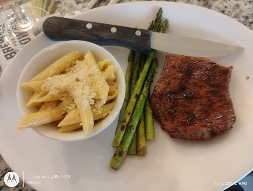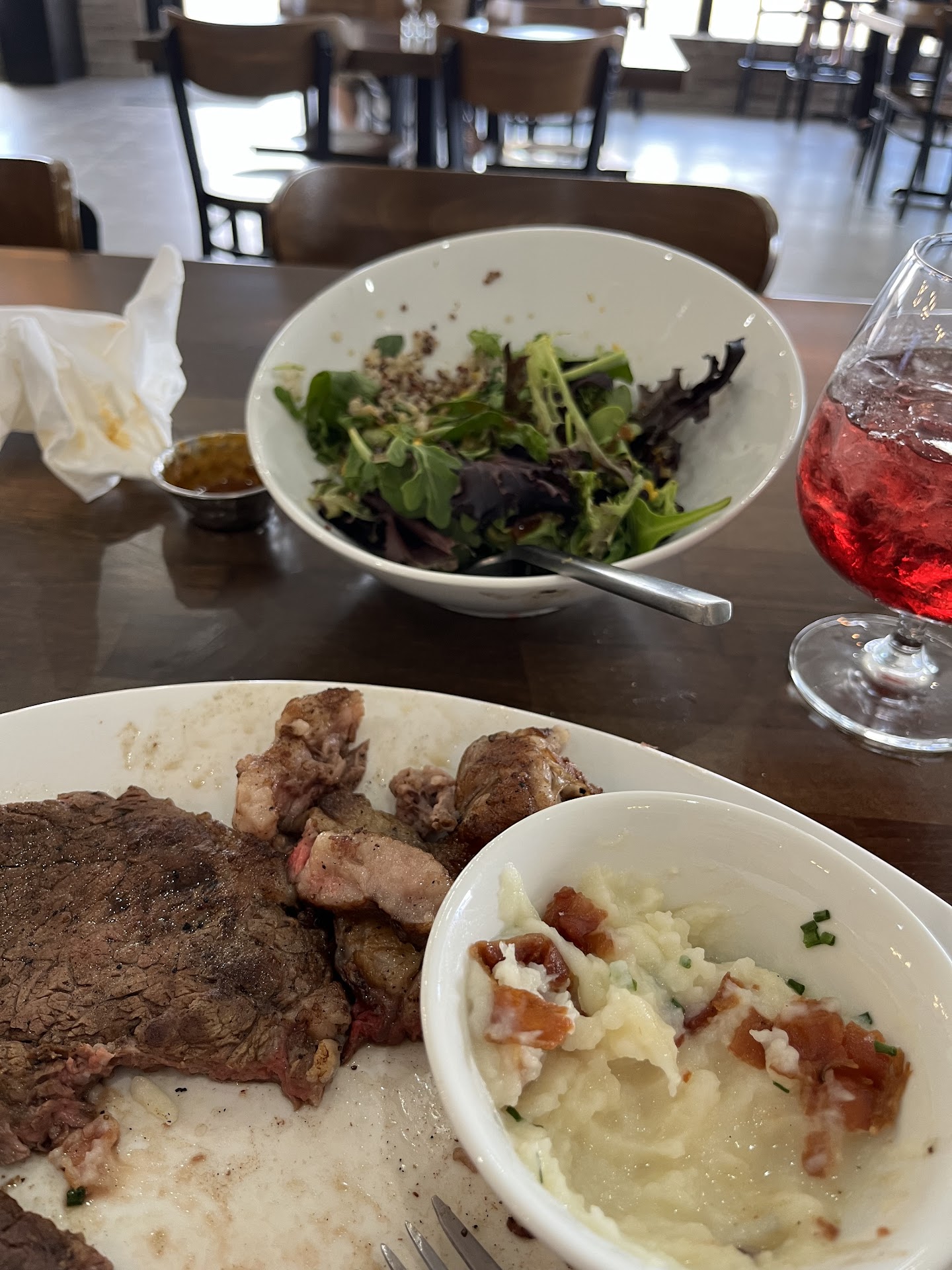 Very limited menu. Only 3 steak options : Ribeye, Sirloin and Strip steak. Sirloin was very thick! But was a deep red in the middle when desired doneness was stated as both Medium and Medium well on 2 seperate steaks. The asparagus was hard almost all the way throughout. Having tried my friends food, the M.I. Burger was just, ok. The meat itself smelled nice but tasted like a typical burger, you'll get a better burger at Applebee's. The fries were typical steak fries with no seasoning other than a sprinklng of salt. The mac and cheese was solid, but nothing mindblowing. Cheese cake was solid enough, not too expensive and had a nice lemon flavor (which was not specified on the menu). The bread was just like a cheap baguette you would get from walmart, except worse because it was hard and below room temperature. They were out of the homemade pasta, huge dissapointment. Also out of baked potatoes, and we were even told that we were the last table to recieve bread, as they had just run out. Overall, the steak was very good, but not cooked to specifications, half of the things we ordered were not available, and the service was not great, despite us being one of only 3 tables with 3 waitresses working. My recommendation is go to Applebee's you will get the same thing except 20% cheaper and it will be slightly more rowdy. I was sitting at 3 stars but the lack of options and high prices for this experience just made 3 feel...