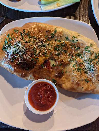 On my most recent visit my friend and I got a "Meatball Calzone" and a Strombolli. The both are presented similarly: a large "half circle," too huge to fit on a large plate, both had the tomato sauce served on the side in a separate little cup. The Meatball Calazone had a tremendous amount of ricotta and mozzarella cheeses and a generous amount of meat, and nothing else. It was oooey-gooey paradise. The Strombolli was packed full of everything, with lots of black olives, meats, and cheese, but much less cheese than the Calazone. My friend and I are both adults with big appetites, and we each were only able to eat 1/2 of our dish. We also brough a pizza home for 3 hungry teenagers, and they managed to devour our leftovers and the pie.
