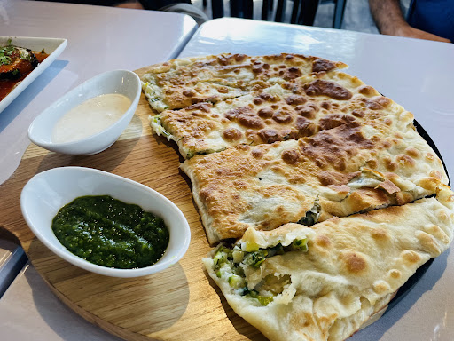 Overall, absolutely delicious, tangy, and spiced thoroughly across all fronts. We had the Badenjon Buranee (eggplants w/ spiced & yogurt—well-cooked, tangy, great to dip your bread in), Bolanee (delicious fried bread stuffed with potatoes and leeks—a favorite now and comes with a spicy chutney and a ranch-like sauce), Mast-o-Khair (adds a nice cucumber yogurt condiment, akin to raita, to all the main courses—maybe get two for bigger parties). Then for mains, Chapli Kabob, Chicken Kabob, and the falafel wrap. The first two had rice sides, the latter had French fries.