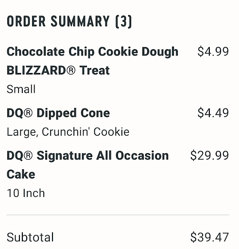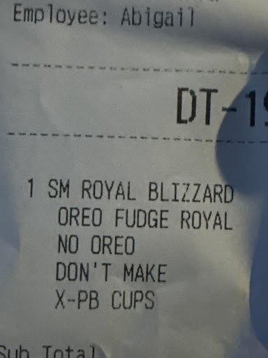 Read moreOrdered on the app, got to the store for pickup only to be told they didn't have the cookie crunch topping. Since we had only ordered the cone to try the cookie topping, we asked if they could give us a blizzard instead. We were told no because it was a mobile order. They got the manager who said they would give us a mini blizzard, even though I paid more for the ice cream cone. He led us to believe they were paying for the difference of the mini blizzard when I told him the small would have been a comparable deal as I would have been paying more than the store price for the mini blizzard.