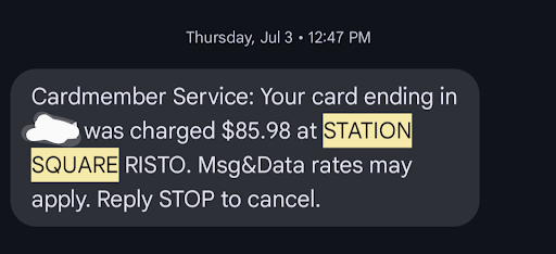 On July 3rd I ordered take out via the Toast app. Soon after I made the order my wife told me she was going into labor. I immediately called station square to cancel the order (about 45 min after ordering). The hostess told me "Ok we'll take care of it". So I assumed I'd be refunded. Unfortunately that did not happen. I checked my statement and saw the charge was still there. Charged my card on July 3rd and manually entered July 7th. (See screenshot for proof)