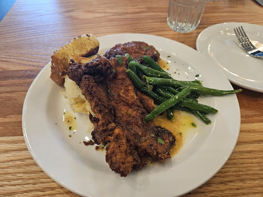 I ordered the fried chicken, and it was nothing short of perfection. Crispy on the outside and tender on the inside, it was clear that this dish was crafted with care and expertise. The accompanying mashed potatoes were creamy and comforting, paired beautifully with the rich pan gravy. The green beans were cooked just right, maintaining a delightful crunch, and the cornbread was a heavenly, slightly sweet complement to the savory main course.
