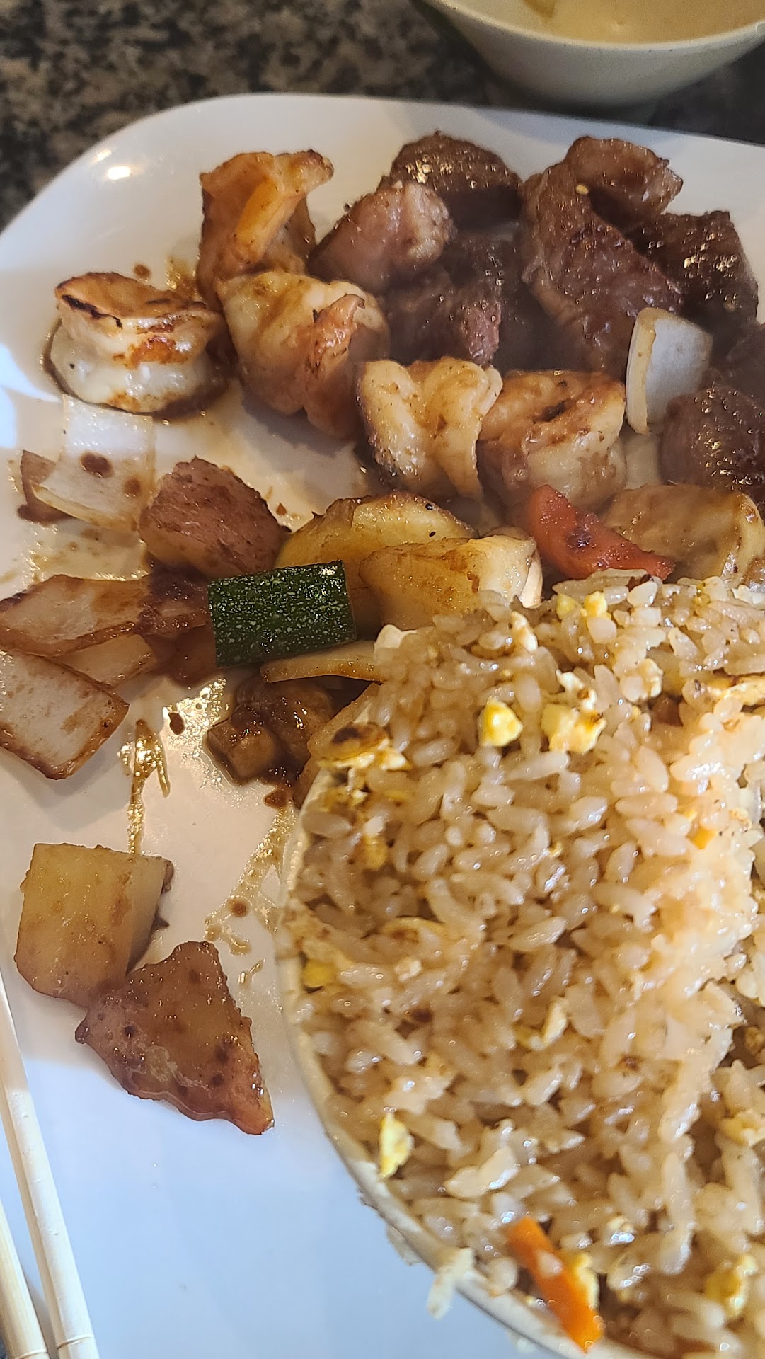 Ā Ā Ā Read moreService was terrible! We got there around 5:45, they took awhile to get our order and we had to wait until another family sat down and ordered before the chef came out around 6:45, which was an hour later! He ignored us and made conversation with the other family. He completely skipped asking me how I want my food. I ordered steak and shrimp and he gave me half a steak and 6 shrimp while piling shrimp and steak on the other family. He kept saying stuff about us being Asian and how the other family was white and that's just ridiculous, continuously commenting how we are asian. So what if I am asian? The picture I posted is exactly all he gave me, this was right as he finished piling food on the other families plates. 30 dollars for this plate of half a steak and 6 shrimp, lukewarm(at best) onion soup and a small salad. They did not refill drinks, and my son ordered steamed rice and they charged us $3.50 for fried rice. I would give this restaurant zero stars if I could. Spent $121.00 for 3 people for trash, racist service and mediocre food. That's just 3 hibachi entrees, no...