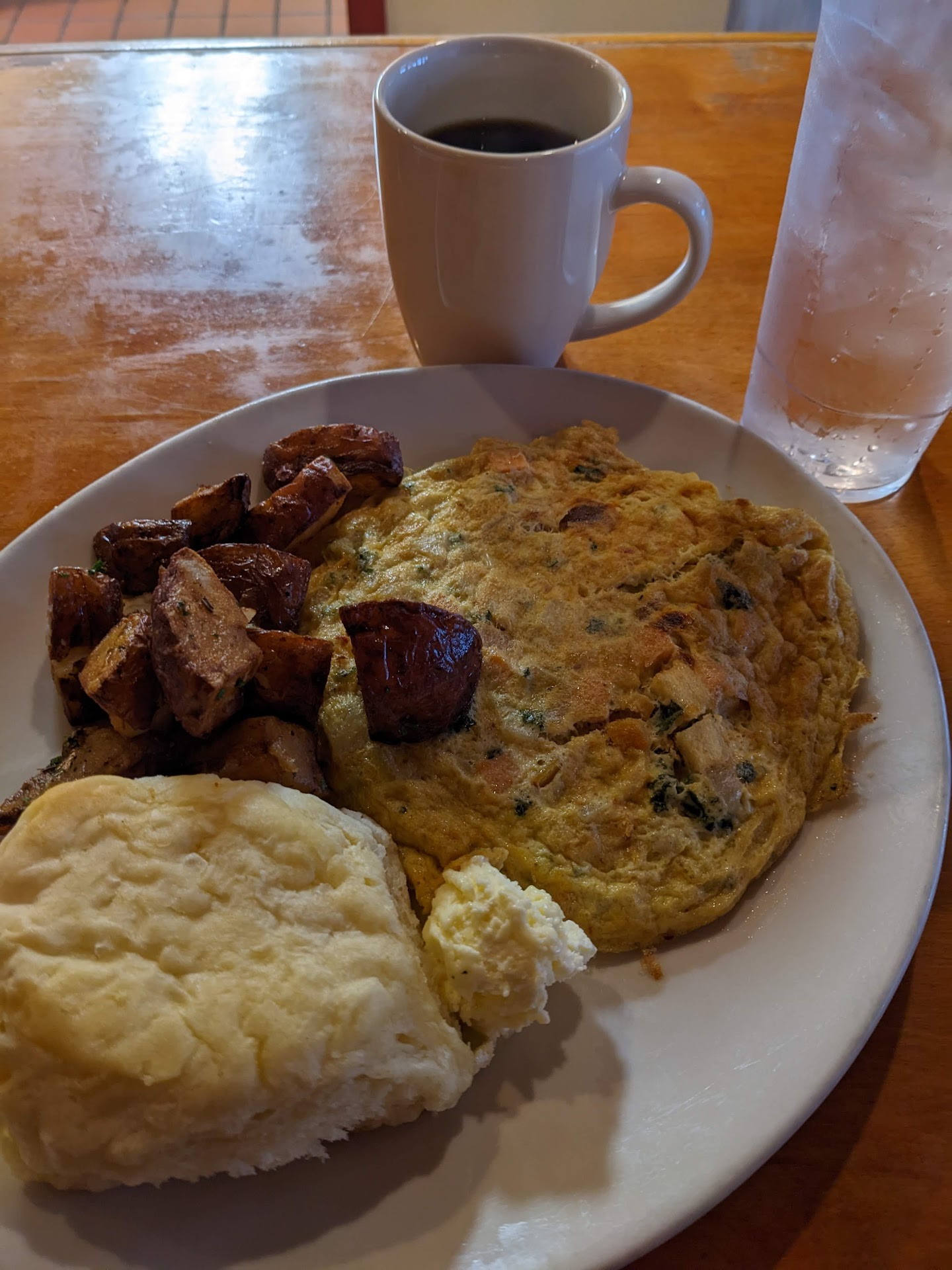 Staff is super nice and helpful. Husband was about to order a full stack of the blueberry pancakes with berry compote for us to split when the waitress suggested that might be too large and recommended the half stack. The pancakes were also great, fluffy and thick, about 8 inch diameter. The berry compote was super tasty, great with or without syrup. Waitress also offered a pop for the road, brought a 20 oz to go cup.