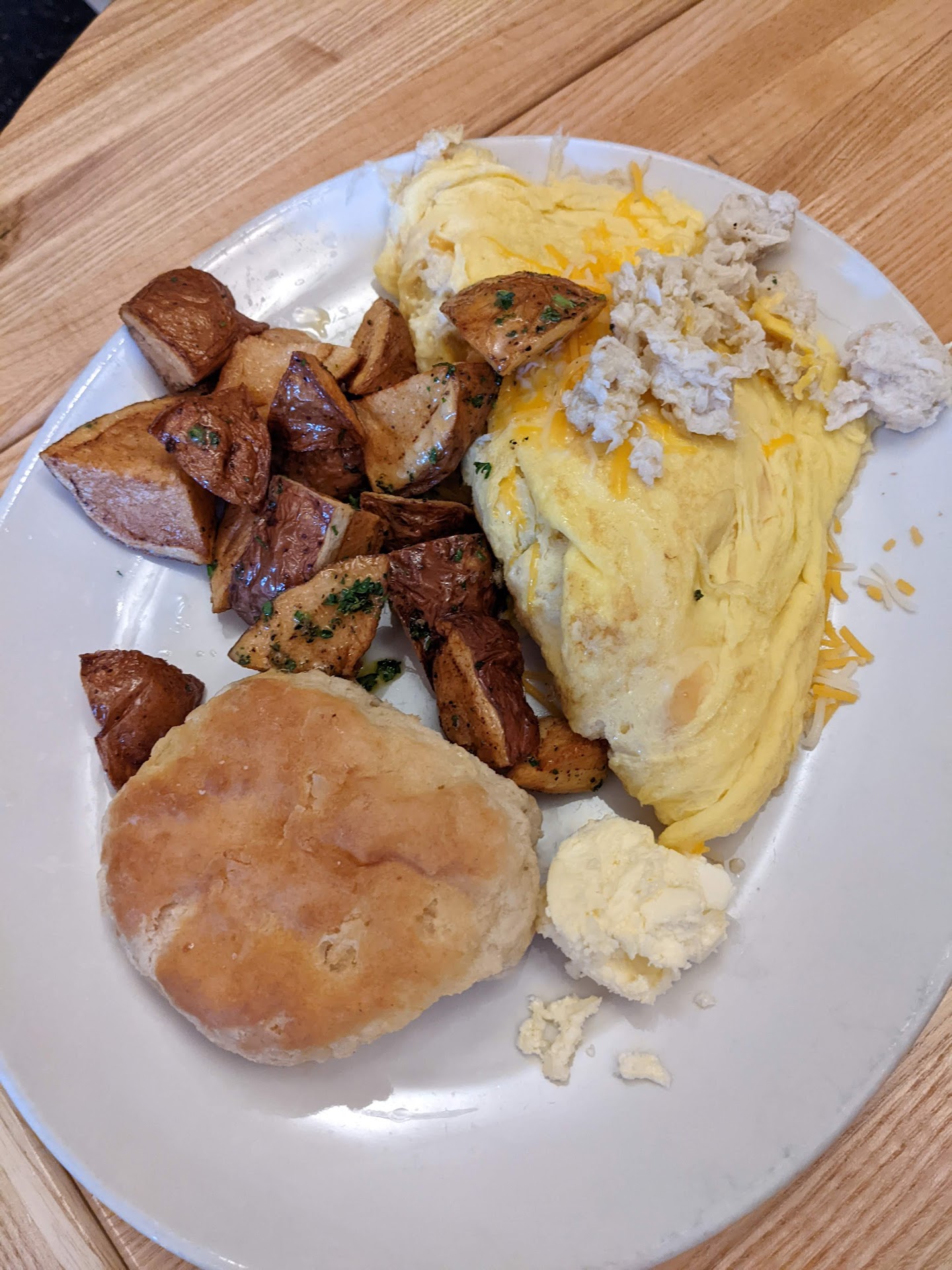 Had the pork tenderloin sandwich at first visit. Very good. However, breakfast was perfection. I had the crab benedict, so tasty! The honey wheat english muffin offsets the savory hollandaise and spicy andouille sausage well. My husband got the "don't be crabby" omlette, which he absolutely loved! He says they definitely didn't scrimp on the crab meat, eggs were perfectly fluffy, and the biscuit and breakfast potatoes were delicious. Also got a side of the seasoned bacon to try, not super crispy type bacon, but fully cooked and flavorful.