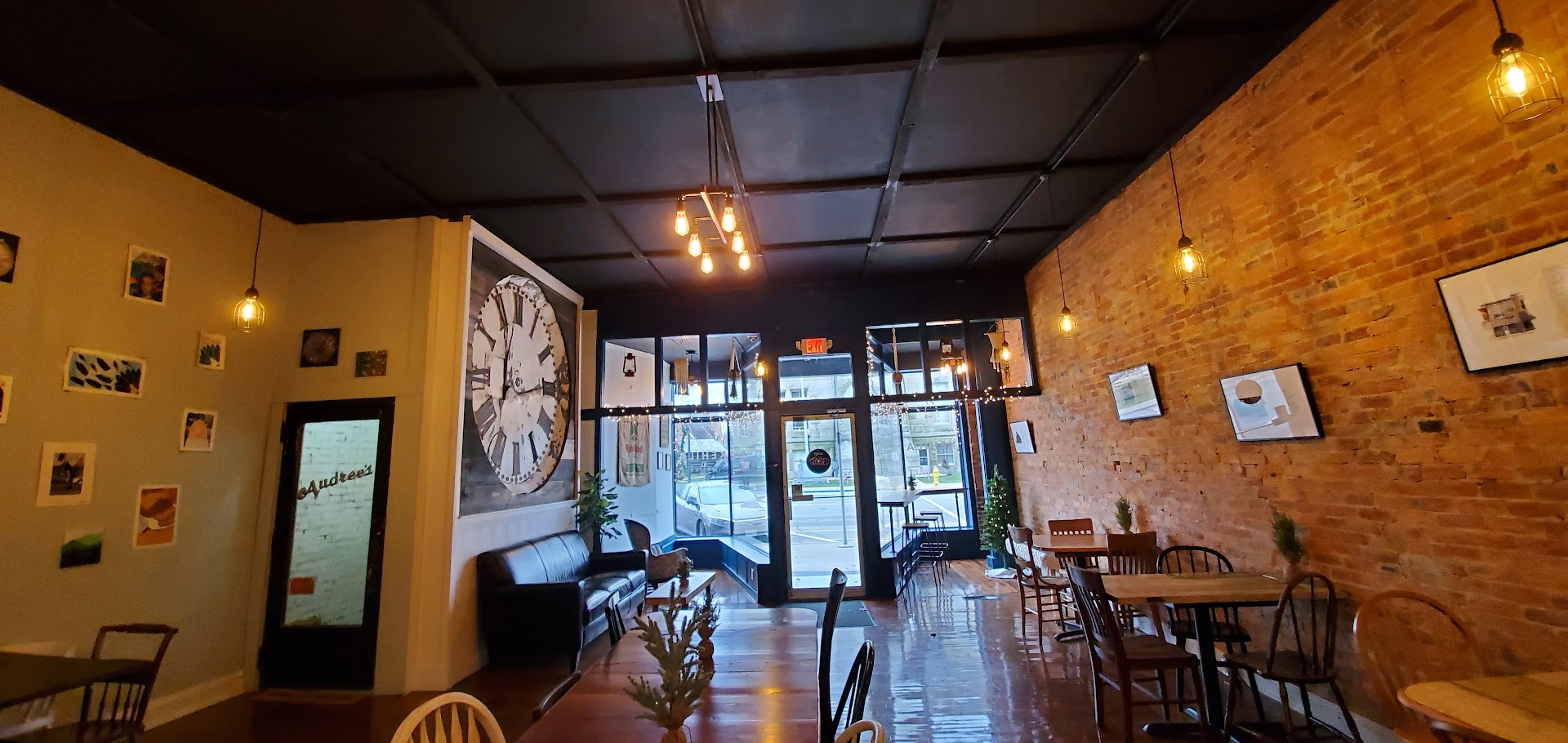 Kehlia Coffee in Liberty, Indiana, is an absolute gem that perfectly blends charm, comfort, and quality. From the moment you step inside, you're welcomed by an abundance of natural light that highlights the inviting atmosphere. The exposed brick wall and the original courthouse clock add a touch of history, while the eclectic mix of chairs and tables makes the space feel effortlessly cozy.