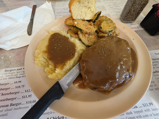 Read moreWe were there around 230.. the salad bar was VERY basic with 5 items.. cucumbers. Tomatoes red onion. Lettuce and cheese. There was crackers..I had the chicken stripe m.p and Texas toast.. it was very basic as well with a very thin batter. The chicken was hot. The gravy and mashed.. barely warmed. He had the hamburger steak. Which i did not care for and would never order..I Also would not get those chicken tenders again. They looked like the came frozen. But she says no.. they battered them in house? On his plate there were fried zu coins that were very hot and fried fresh . the waitress was very sweet and attentive. I agree with others about it being dated.. but it was a very decent meal for the price and o would make sure to ask them to warm my gravy next time..I hate to select the 10 -20$ because it was barely over.. we only had water and the ticket was around 25 with tax. I would go back of i was in the...