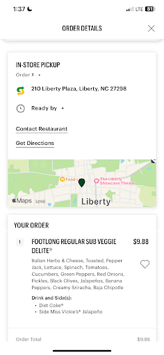 Read moreI just left Subway in Liberty Plaza, Liberty, North Carolina. The gentleman taking my order was very polite And apologetic, but thatâs where it stops. They were out of steak For a steak and cheese sandwich so I switched to chicken and then when starting putting the condiments on it, they were out of chipotle sauce. Looking through the glass at the vegetables, they were very near the bottom Second of the containers And did not look fresh at all I have been going to the subway for the last 15 years and itâs hit or miss sometimes you may get good service and a good sandwich. Sometimes you may get good service and a terrible sandwich or sometimes you may get a good sandwich and terrible service. Very disappointed!!! Have been to many subways across the country and this by far is consistently bad!! Hate to give bad reviews, but I live in this town and would like to be able to get a fresh sandwich here!! Once again, the sales clerk...