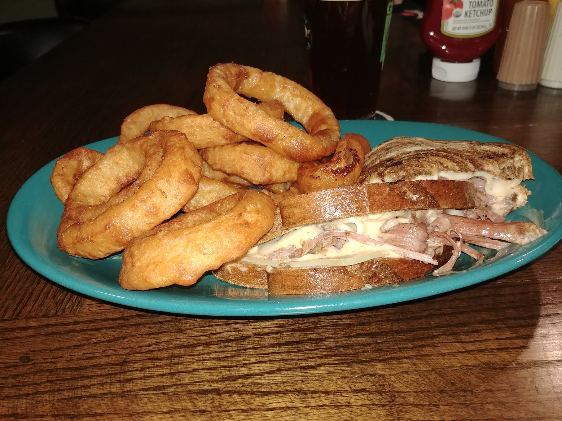 I head towards Liberty where on Hwy H is a place called Boozers! When I got there, it was about 3\4 full, noisy, with people laughing and talking, having a great time! I walked up to the bar sat down, ordered a Dunkel, and started studying the menu. Well now, I see that there is a Reuben sandwich listed. It's been a while since I have had a good old Reuben, I ordered onion rings as a side. With my choices made I sit back and enjoy sipping on my beer.