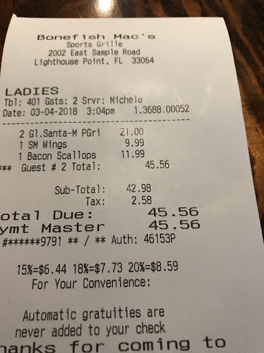 Read moreUpdate: it's been almost a month and silence. I've removed a star. Meanwhile I went to their Coral Springs location and it was night and day. This location should be embarrassed. Not very happy with my experience. The place in itself is nice. Looked clean, my server was lovely (Nicole) I like the decor, they have a great bar and nice atmosphere but I believe the kitchen may have had an off night. The key lime chicken wasn't edible, extremely bitter, they left it in the key lime marinade for too long, heavy citrus changes the texture of the chicken, makes it easier to overcook as well which it was, stringy and horrible. They put cheese all over the mashed potatoes, no cheese listed on menu and the asparagus had curdled butter all over it. My husband had the fried seafood platter, it was drowning in oil. The basket underneath had so much oil that when we picked up the fish it was dripping down in a steady stream. He ate part of the fish and left everything else on the plate. We did not take the left overs. Upon informing our server, she took my concern to the manager who then instead of comping the ill prepared dish, chose to decrease the price by $3 because the fish was partially eaten, not fully because the heavy oil was making my husband sick. Manager also did not visit my table, obviously zero concern for our first experience at Bonefish Mac, I've been in hospitality management my whole life and I found this to be extremely unprofessional. Due to this we won't be returning to this location. We spent $40 and left hungry. Seeing as the manager didn't even bother coming to the table, I'm sure this review will fall on deaf ears. Update: My husband is sick and throwing up. The experience just felt disrespectful at this point. I should have refused to pay for that dish. Really regret going...