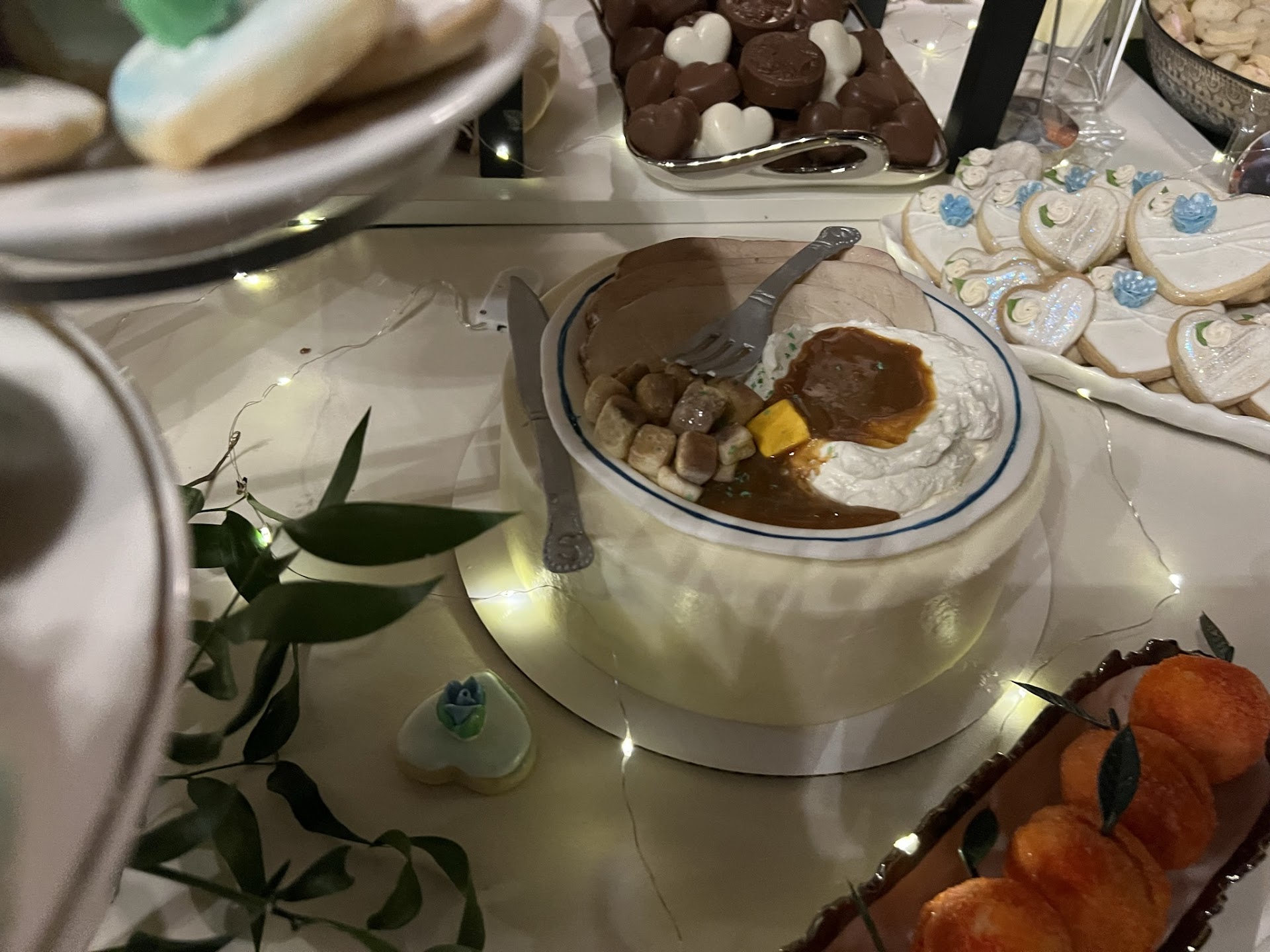 Read moreCarly made this unusual and unique groom’s cake for my son’s wedding this past summer. He was joking around and said he wanted an actual Thanksgiving dinner as his groom’s cake. He didn’t mention another thing about having a groom’s cake after that. He was so surprised when he saw the cake. Carly was amazing to work with and her artistry is amazing. She also made petite fours and sugar cookies with a picture of their pet bunny on it as another surprise for the wedding. I highly recommend...