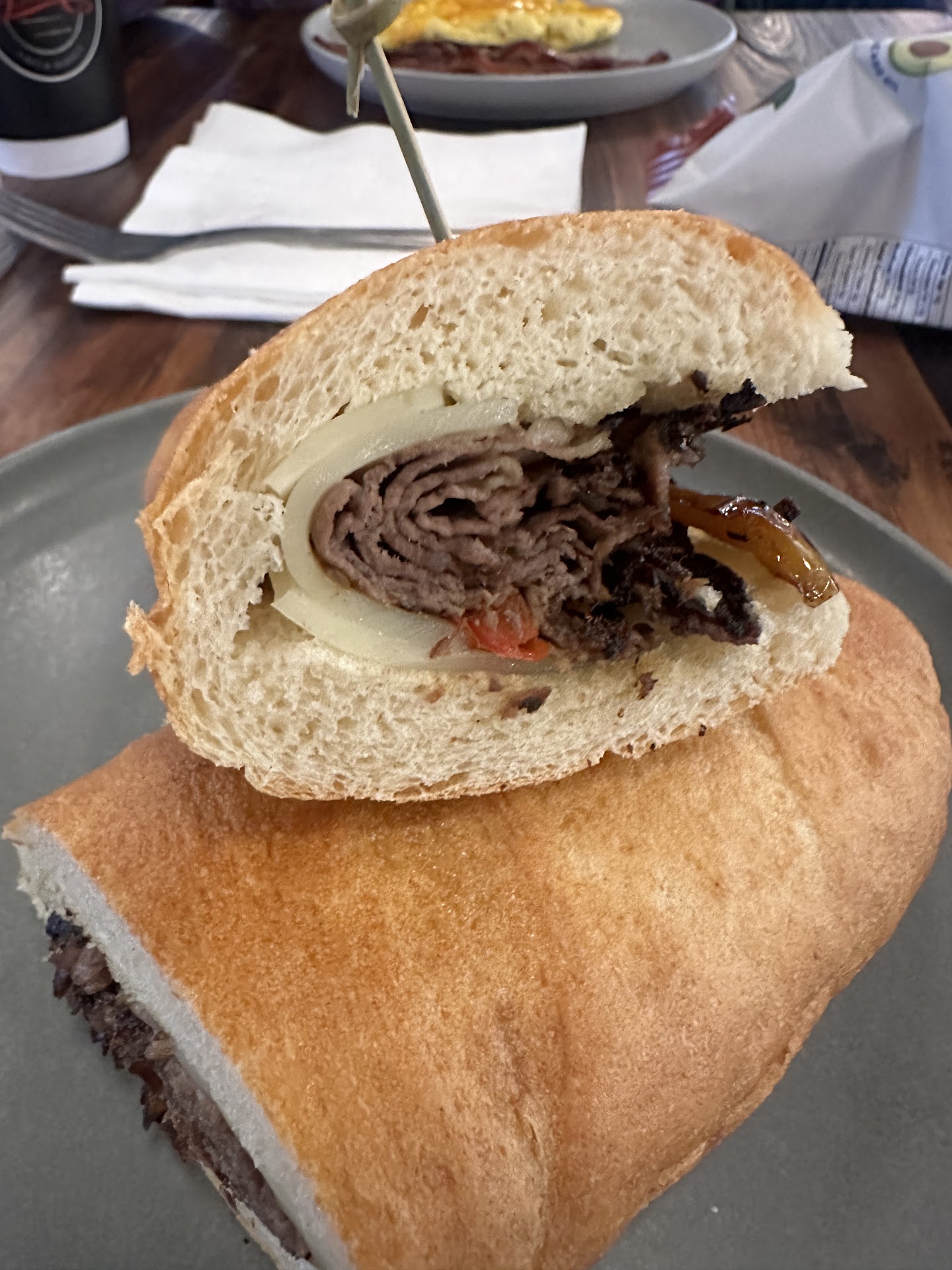 My partner ordered eggs and bacon. The eggs came scrambled with a bunch of herbs and fennel in them (wasn't on the menu, didn't ask for it) and she said they were not tasty. I ordered a "Philly cheese steak" that came out with not enough meat and the cheese was cold.