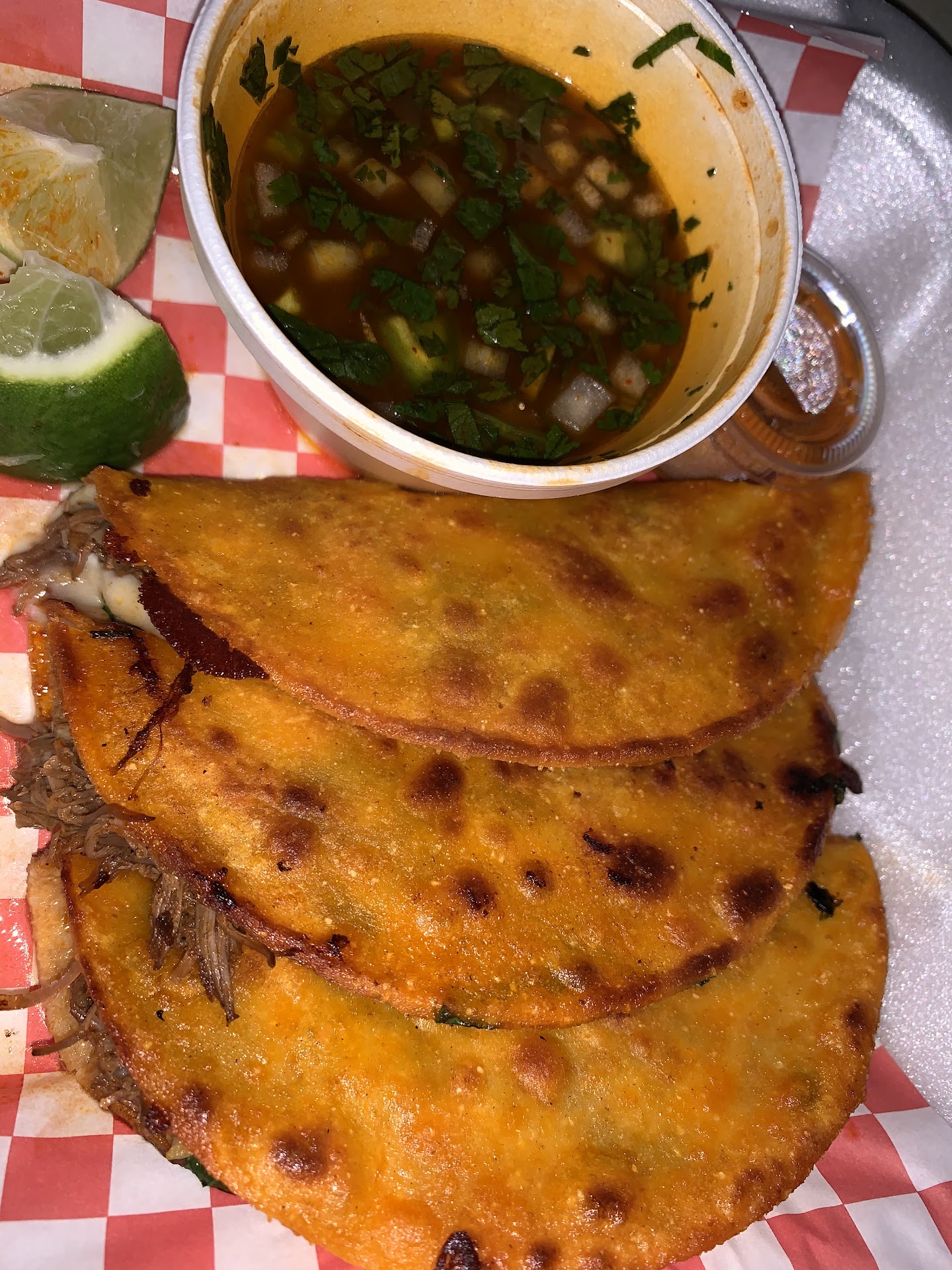 Food: I ordered the birria tacos because I had a MAJOR craving, and BIRRIA!? IN GWINNETT? YES PLEASE! Needless to say I was setting myself up for some disappointment off the bat, but all in all it satisfied my craving. First, the tacos - they were perfectly fried (albeit soggy, but that's probably because it took a bit to be delivered) and still had some crunch to them, were extra cheesy (a bit too much cheese for my taste, but I know some people like that), and decently flavored. As this is birria, I was expecting a much more robust, deep, rich flavor and unfortunately, while the meat was soft and had some flavor, it wasn't nearly up to the standards of some others I've tried around town who specialize in it. The consome was basically just spicy broth without much other flavor, which was fairly disappointing as you want it to give that extra flavor boost when you dip your tacos in it. Additionally, the lime wedges they gave were extra dry, so didn't add much to everything. The shining part of this dish was definitely the salsa picante they give. Putting it in the consome transformed everything and gave it a nice kick that made up for the lack of that rich birria flavor.