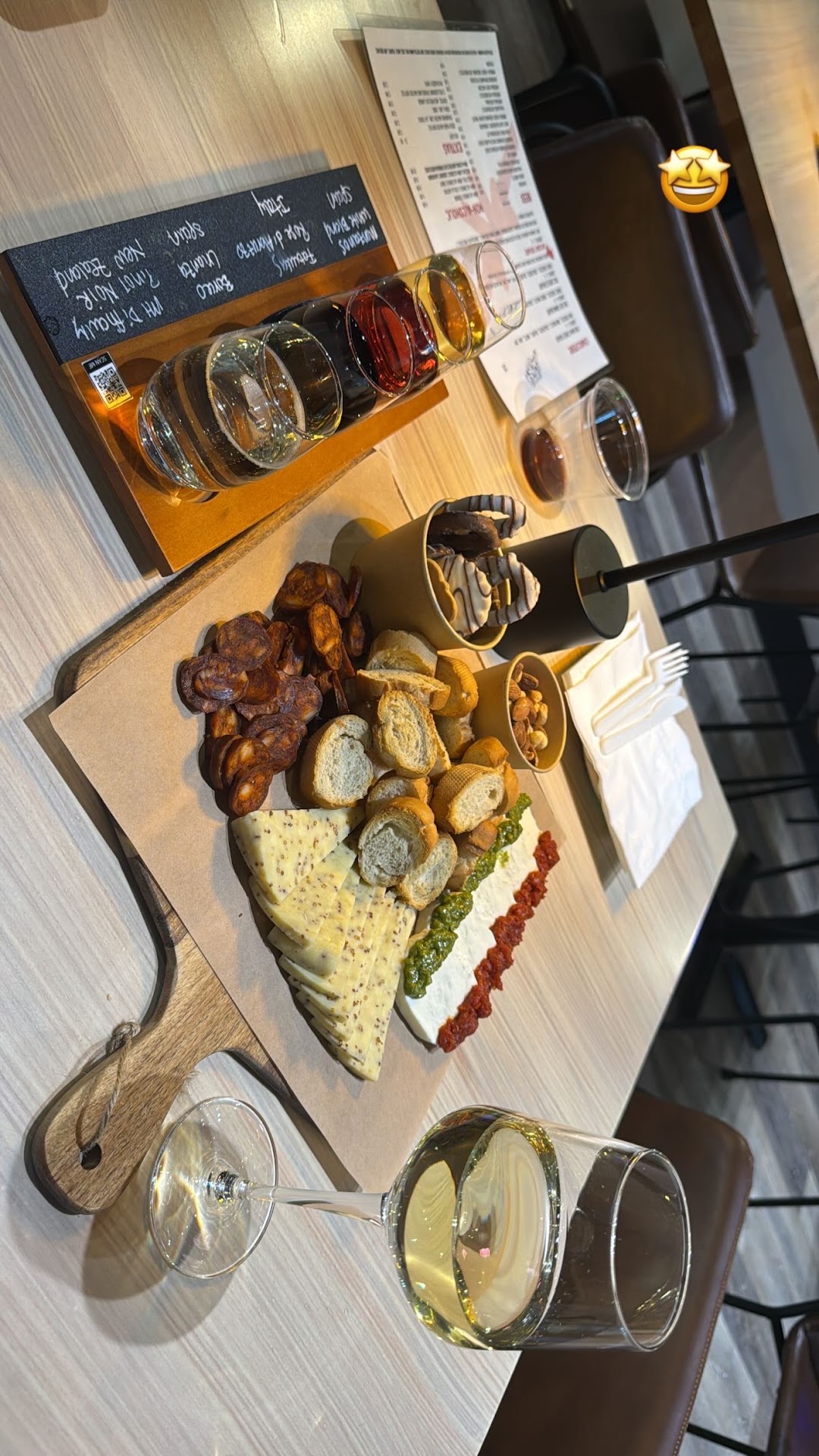 To start on a positive note the cheese charcuterie was great. Said it fed 2 to 3 but 5 or 6 could have enjoyed it. also the guys behind the counter were friendly and welcoming. Unfortunately that was it. We ordered the chardonnay (something from Washington) and it tasted like the vintage was old. Wine bars should know good wine. We went outside and were quickly sent back inside by yellow jackets and flies. Kinda understandable this time of year (but went to another restaurant nearby for dinner and were advised by hostess the bugs were a problem) but many patrons started outside and came in. Also promoting yourself as a wine bar and only having 10 total wines btg is a stretch. My biggest concern was that I had to order at the counter for everything. I would have had 1 or 2 more glasses of wine (or beer) if someone came to my table and took an order. I don't feel like getting up to get another glass of wine after a hard day's work. I go out to be waited on. I really want this place to succeed as we have so little in the area, and I will try again, but if it doesn't change I probably...