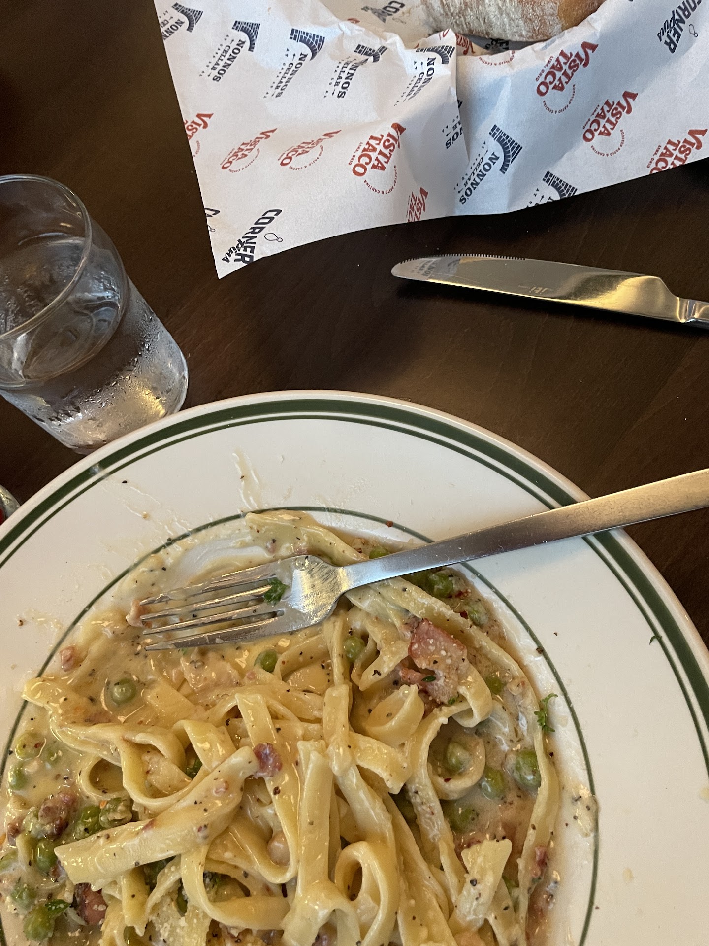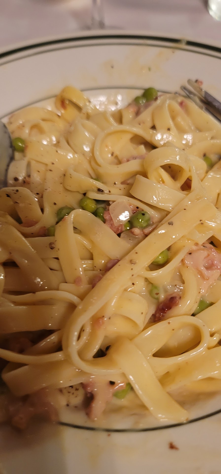We both love Caesar salads and were a bit disappointed in that not being available. However, we both had a terrific side salad with our meal. My husband chose the Great Lakes walleye and said it was cooked perfectly and had a great flavor. I had the fettuccine carbonara, and while it wasn't bad, it wasn't great either. There just wasn't much flavor to it. It was nice to have bread. However, it wasn't toasted or warmed up.