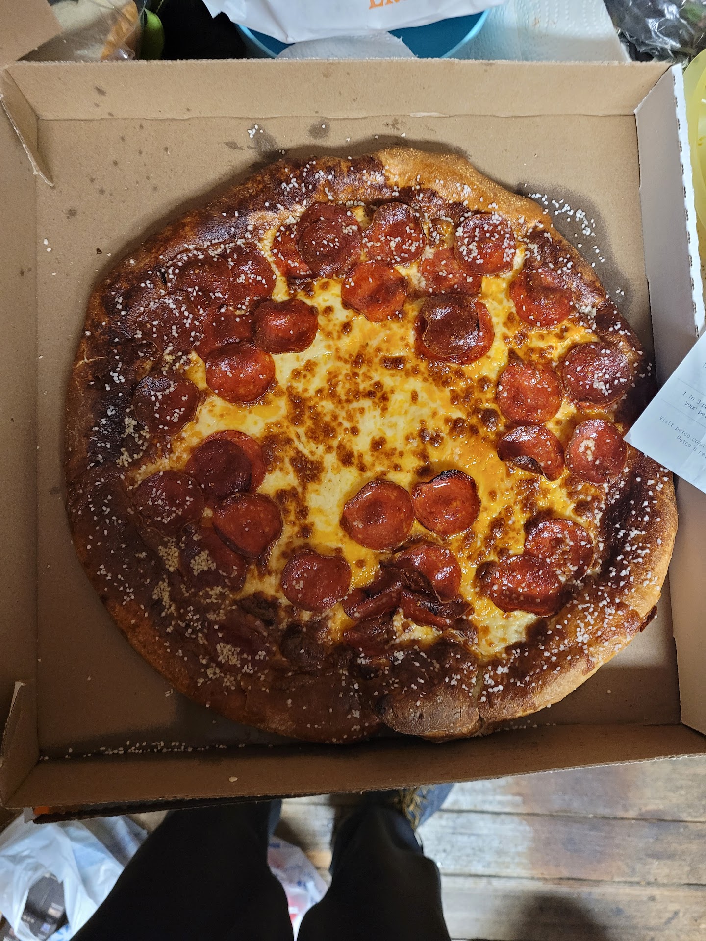 Also ordered a pretzel crust pepperoni with cheese sauce. Crust is burnt, pizza is not cut, heavy salt is all over the pizza, and there was so much butter all over it that it ruined my wife's t-shirt when it literally ran out of the box and all over her. Absolutely not edible.