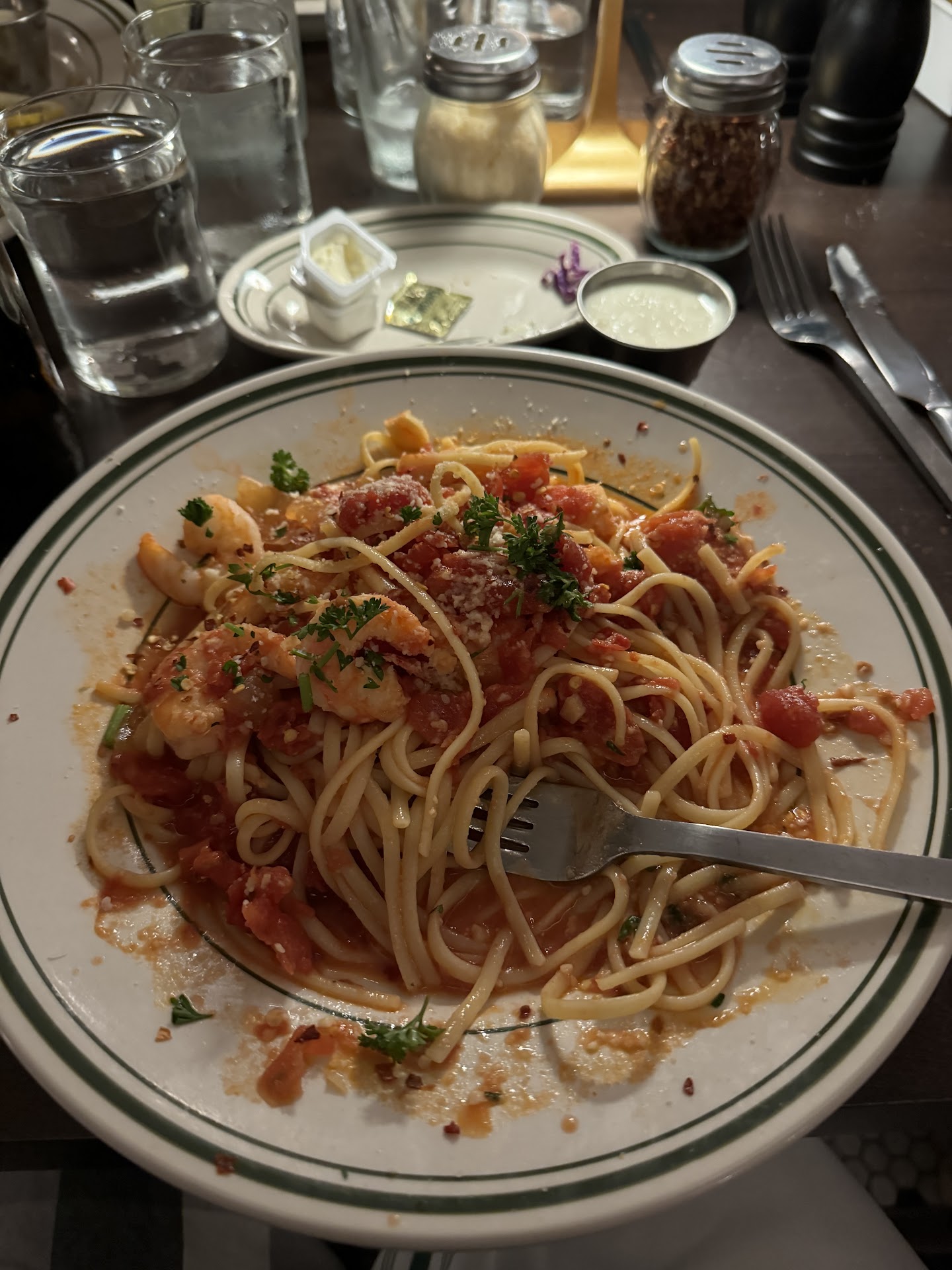 We made reservations for our anniversary dinner and were taken to our table immediately upon arrival. Our waitress was Kendall and she greeted us and asked about drinks. We each ordered a sweet tea and she said it would take a minute because she had to go upstairs to get it, which was no big deal and she brought us waters as we waited. We ordered "the feast." As we waited, Kendall brought out bread, which was nothing special and she came back a little later because she forgot to give us butter with our bread. I then had to ask for silverware because we still didn't have any, again, no huge issue. Our appetizer and salads both came out before we had gotten our teas. The bruschetta was really flavorful, but the bread wasn't toasted at all so it was a little disappointing. The salad was ok, but we each had to pick some of the food out because it wasn't the best quality. It definitely needed salt and pepper. Next came out the rigatoni, meatballs and sausage and peas and garlic. All of it needed some seasoning, but the meatballs were the best part. The sauce was definitely on the sweet end, but again, it was not bad overall. Lastly, our dessert came out which was mini cannoli and lemon cake. The cake was very light and flavorful. The atmosphere is beautiful, but there was a lot of traffic and many people asking where the restroom is. I'm not sure if this traffic was from the main restaurant or the pins place or what, but it was a bit distracting to be right in the line of traffic. We would try again as I expect with a new restaurant to have...