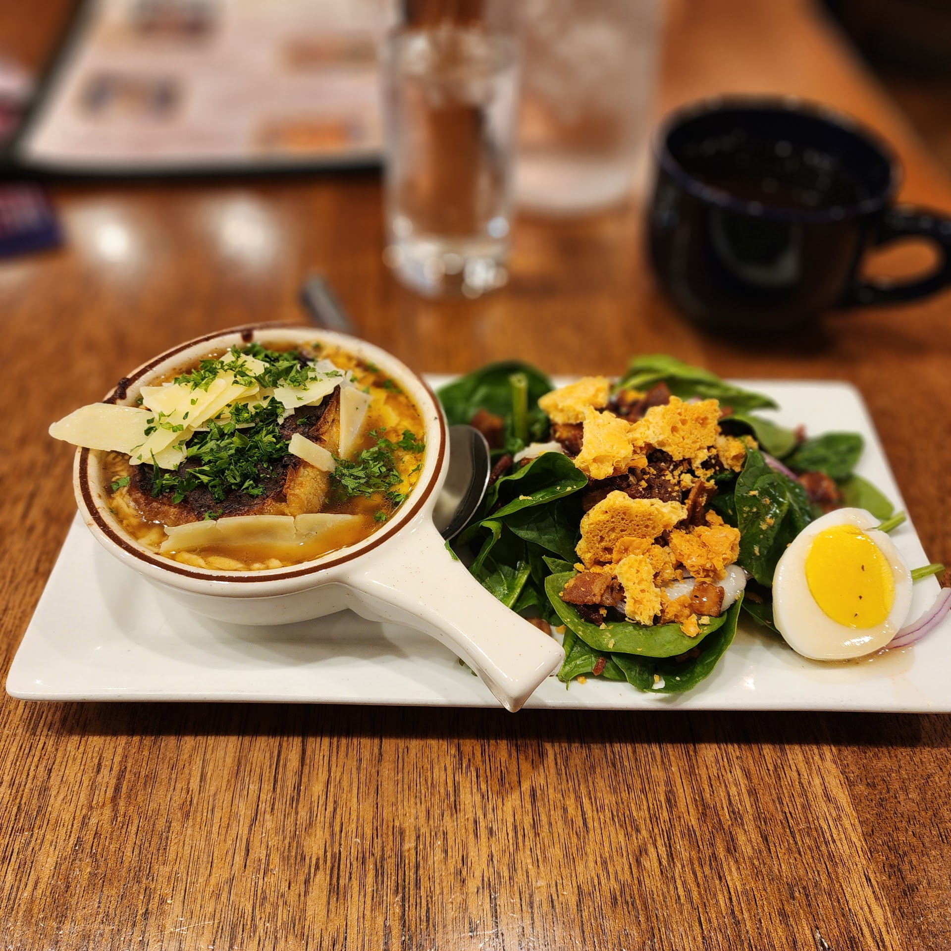 For a starter, I had the soup and salad combo. The spinach salad was very good with a warm bacon dressing, and the parmesan crisps were a great addition. The French onion soup was a bit on the thin side, and the crouton was burned and so dry that it wouldn't even absorb the soup. It floated like a dark brown life raft; I should have taken that as an omen and left it there. However, I was starving and had skipped lunch in anticipation.