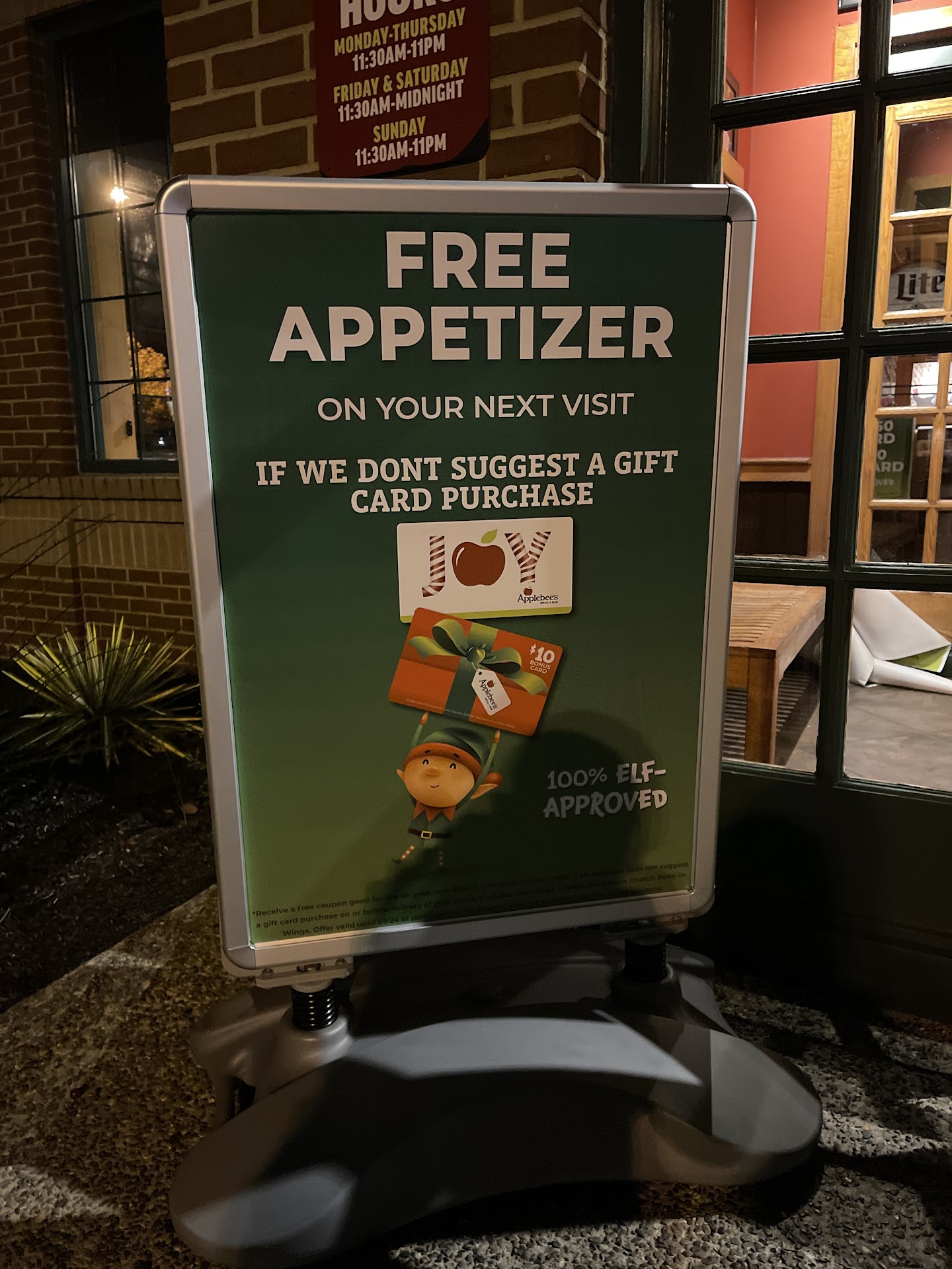 Ā Ā Ā Read moreIād give this place negative stars if I could. My friend in I go in and are told the table will be available in 10min. While waiting outside we see two couples who came after us go in before us. 30min later we finally get our table. Takes 10-15min for server to come over, brings no silverware. My friend and I came in to have drinks only and were told that we had to order appetizers in order to drink alcoholic drinks so I order fries and my friend ordered their pretzel app... we never see the waitress who took out order again another waitress brings our food out 20 min after ordering fries are colder than Antarctica and hard as a rock, and my friends pretzels werenāt even edible. We ask to speak to a manager who never ended up coming.... it gets better. We put an order in for boneless wings to replace the pretzels, and were told the pretzels were to come off the bill, they didnāt and a manger never came to fix it after our multiple complaints. While waiting for the wings to come out my friend orders another drink. 20min must have gone by before any worker walks by again and acknowledges that we are there. We stop a busboy and ask where our food/drink is. He comes back shortly after and tells us that the bartender isnāt make drinks right now and is on the back watching football. Are you kidding me? No Iām not making this up! We tell him to cancel both the wings and drink since weāve spent already close to an hour inside and had other arrangements we had to get to. Now another server brings us our bill, itās completely incorrect. We were charged the pretzels and they refused to take them off, the beer I ordered was advertised out front for $2.50 and was charged $4.50, no biggie but when asked why the 2.50 wasnāt honored I was told it was because I didnāt order an app. No where did it say you had to order an app to be entitled to drink specials. Place is completely dirty, workers have no personality and we never did get our silverware after asking for it twice. Negative 5 stars. Do yourself a favor and go across the street to Texas Roadhouse, this is by far the worst Applebees experience Iāve ever had! Also note the place was completely empty and our server only had one other table in the section that she spent most of the time speaking to since that poor tables order came out incorrectly and they were also trying to correct their bill. HORRIBLE...