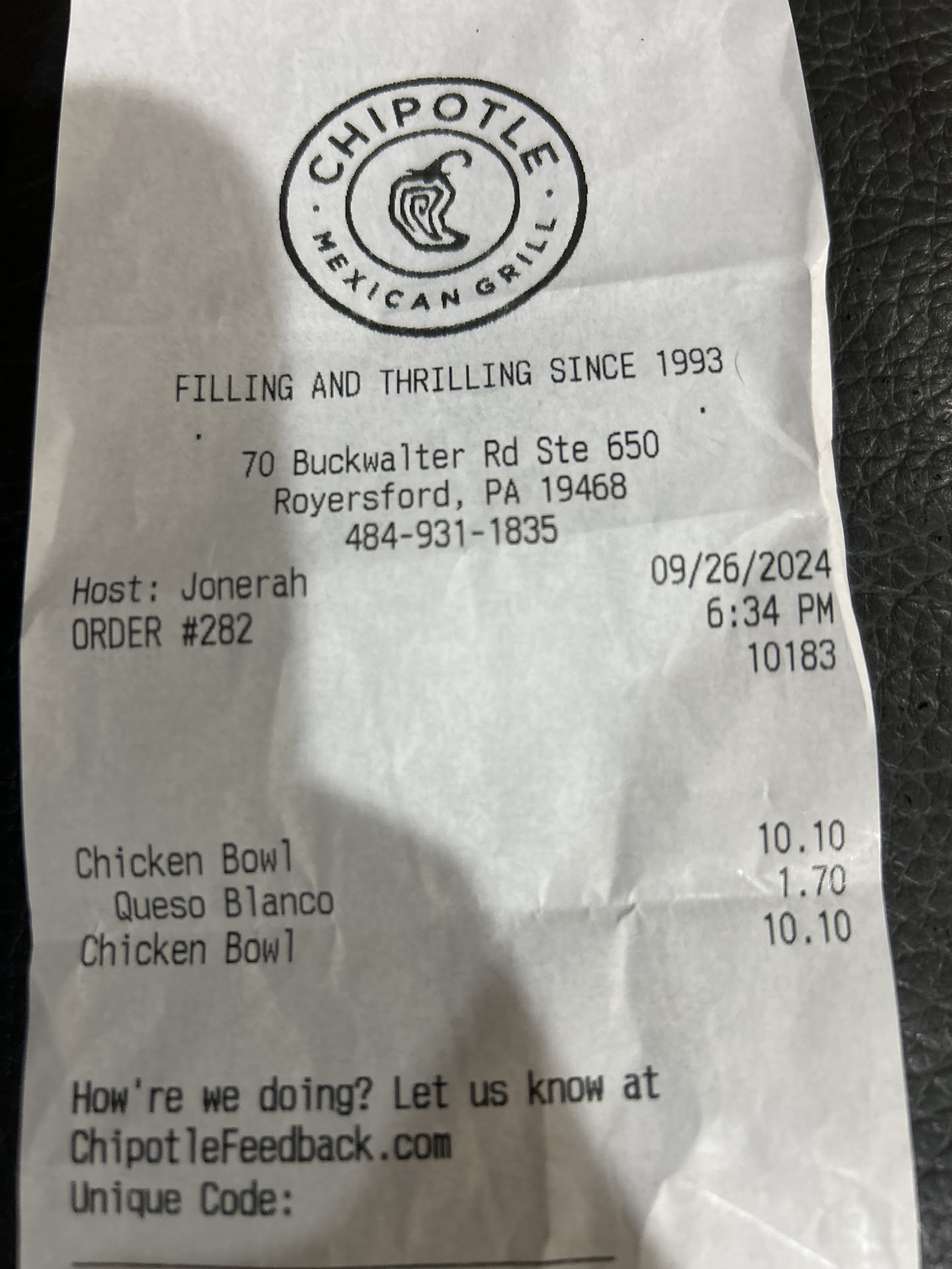 The wait to order was far to long considering there was only one group ahead of us when we entered - service is very slow. After placing our order and moving down the assembly line, we came to realize they were out of a ton of things. No sour cream, most of the salsa was gone, barely any guac, no corn. Of course you don’t realize this until it’s too late. We asked the ray of sunshine if anything will be refilled soon, the response was no that’s all they had so we sucked it up and proceeded to paying. While paying, all the things I just listed got refilled.
