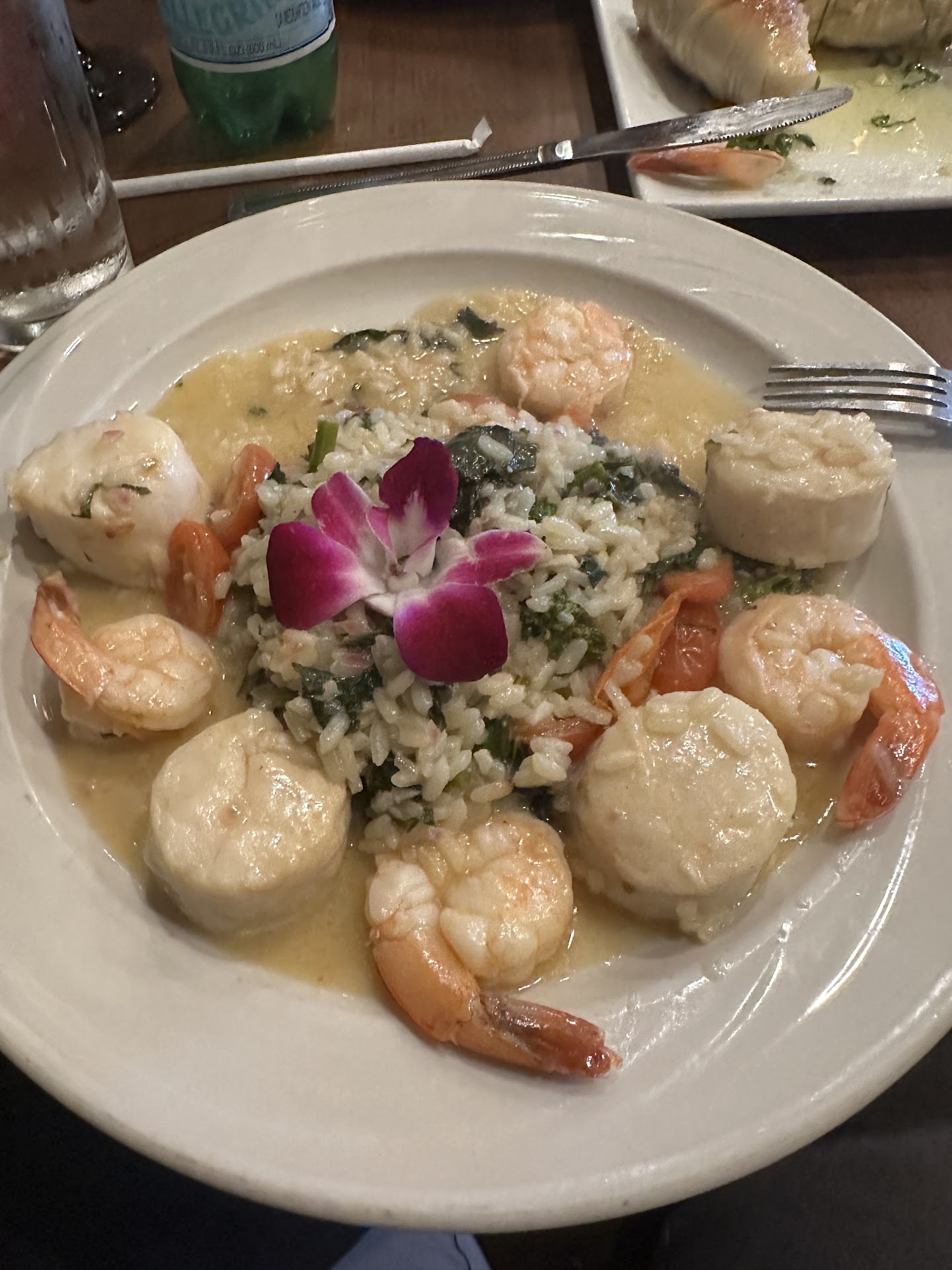 For dinner we had mussels tossed in white wine sauce and a chicken and crab dish topped with a light Marsala cream sauce. This dish is new and not on their Internet-posted menu. Apparently it’s called the House Special. We chose linguine to accompany both meals. Portions sizes were more than adequate but not overwhelming.