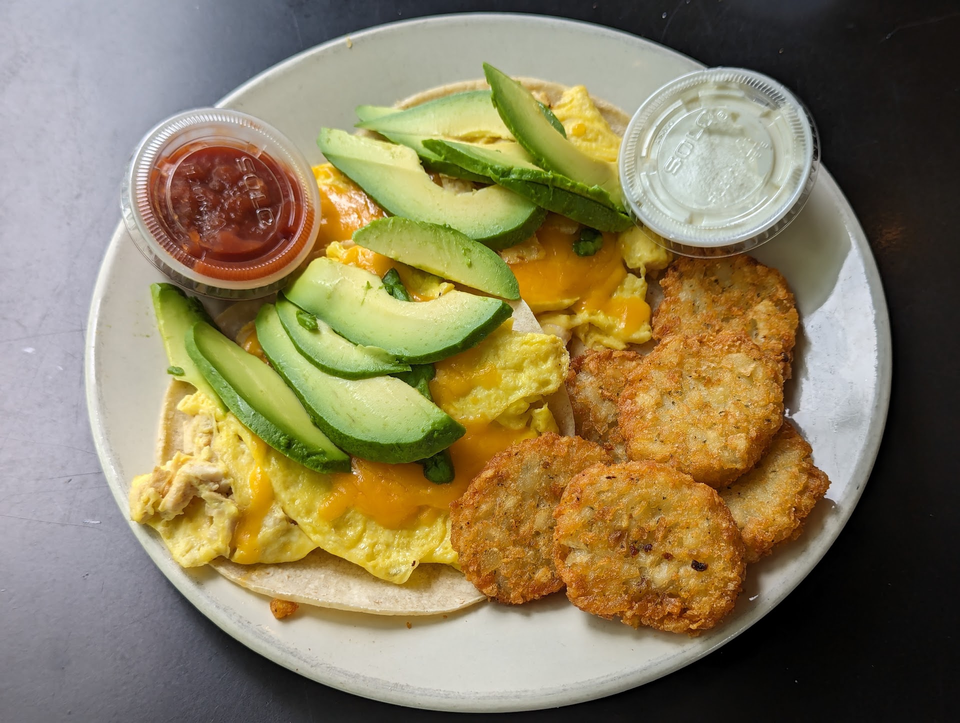 The food was mediocre at best. The pancakes were pale and only became palatable with the addition of syrup. The "seasoned" chicken in the Breakfast Tacos lacked flavor, and we had to rely on the provided Frank's Extra Hot sauce to enhance the taste. The Lemon Dressed Mixed Greens dressing was lacking in lemon flavor; it seemed like plain oil with barely detectable seasoning. The Potato Cakes were the highlight of the meal.
