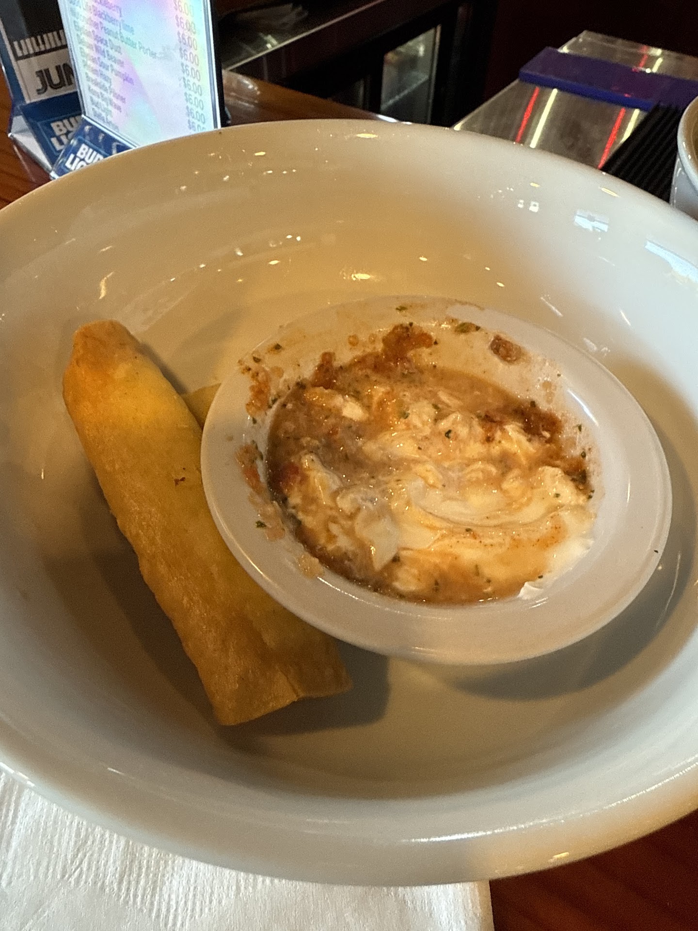 I didnāt see anything on the lunch menu that wasnāt just basic fair. So I just defaulted to the bar menu and ordered Taquitos. Now, with this dish itās important to have your glasses because they fill them with 98%cream cheese and 2% pickled jalapeƱo bits. Mine was plunked into a deep bowl?!? And then a smaller dish was plunked into that which contained my āsalsaā and sour cream all mingled together. Eating a deep fried corn tube filled with cream cheese is difficult after a couple of bites. Itās rich, and well tasted basically like a large amount of cream cheese.