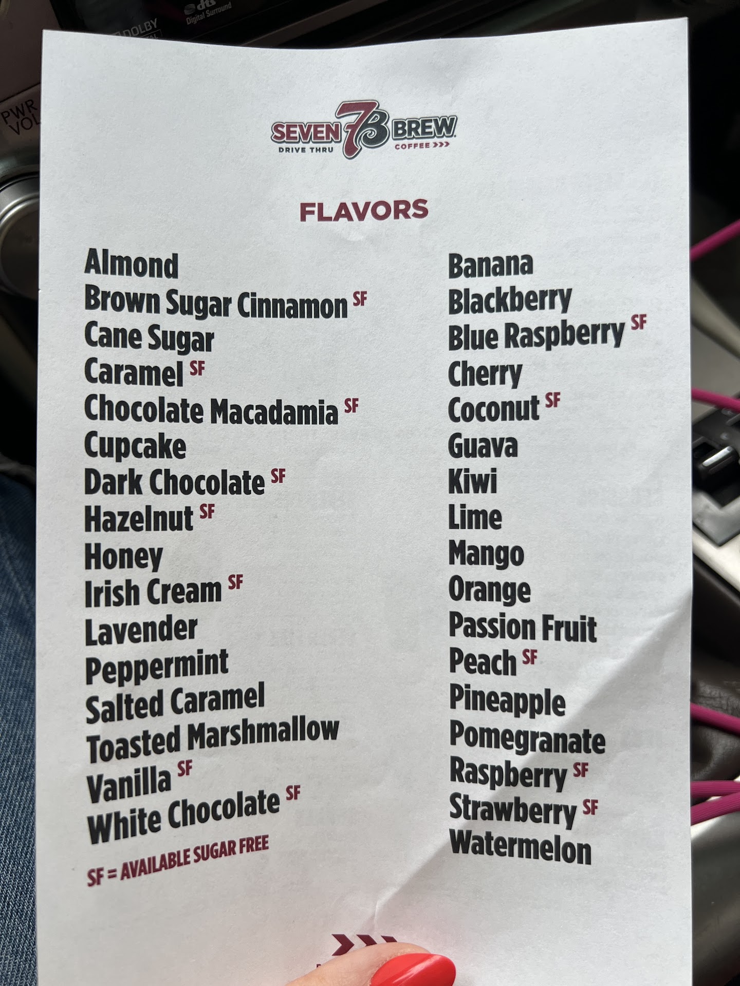 Read moreI normally love 7 brew. Service was lackluster today. It was sprinkling and the barista would not come down the line to take orders. She said she refuses to go out. Um, what?! Meanwhile, I watched 7, SEVEN, cars get served in the other line! My daughter ordered a drink with oatmilk as she's lactose intolerant. It comes out, looking totally different than the last dozen times she's ordered it... and had cold foam... it's never had cold foam before and they didn't ask... and what's the point of oatmilk if they're gonna top it with cold foam!? Love 7 brew.... the gal barista wasn't exhibiting good customer service today. Very...