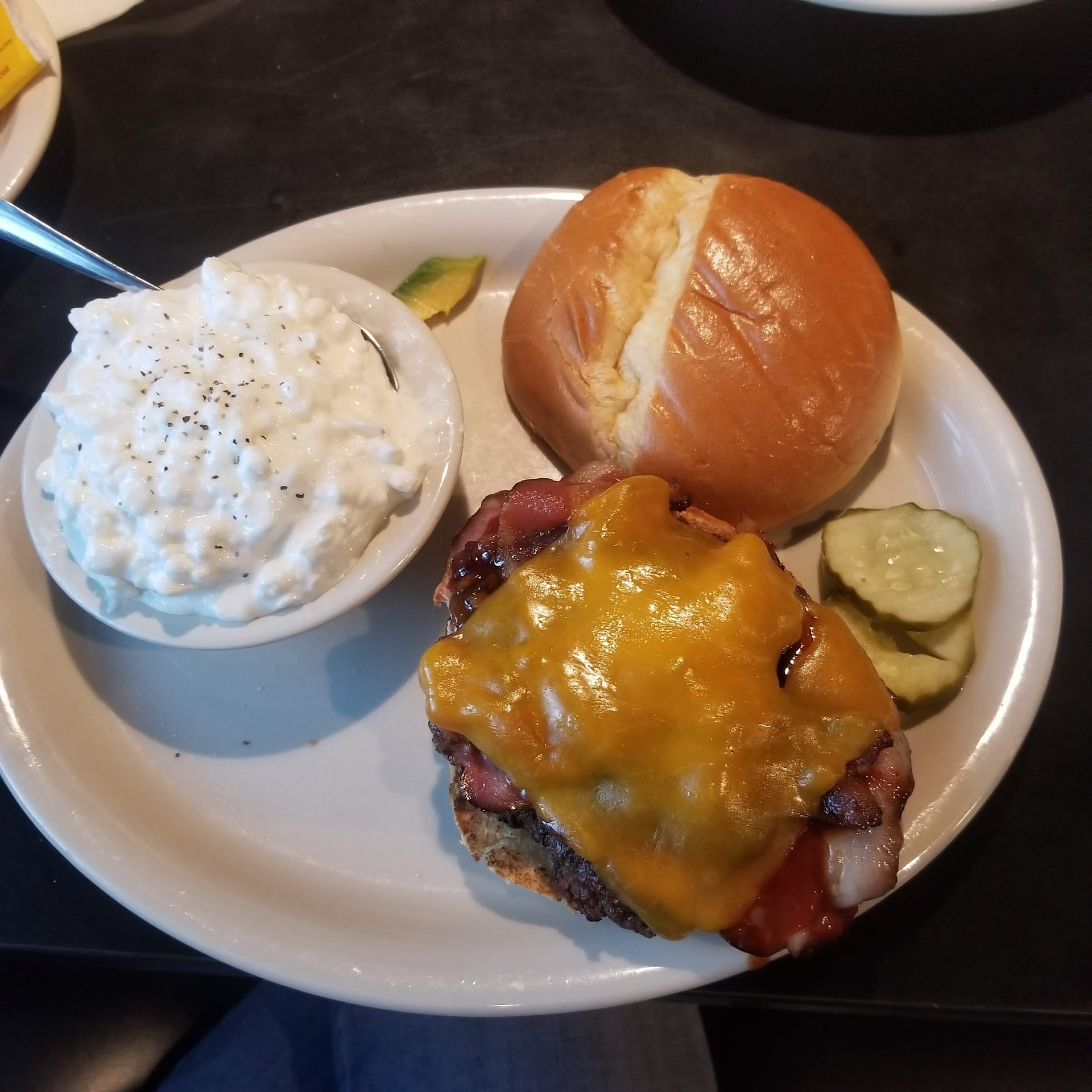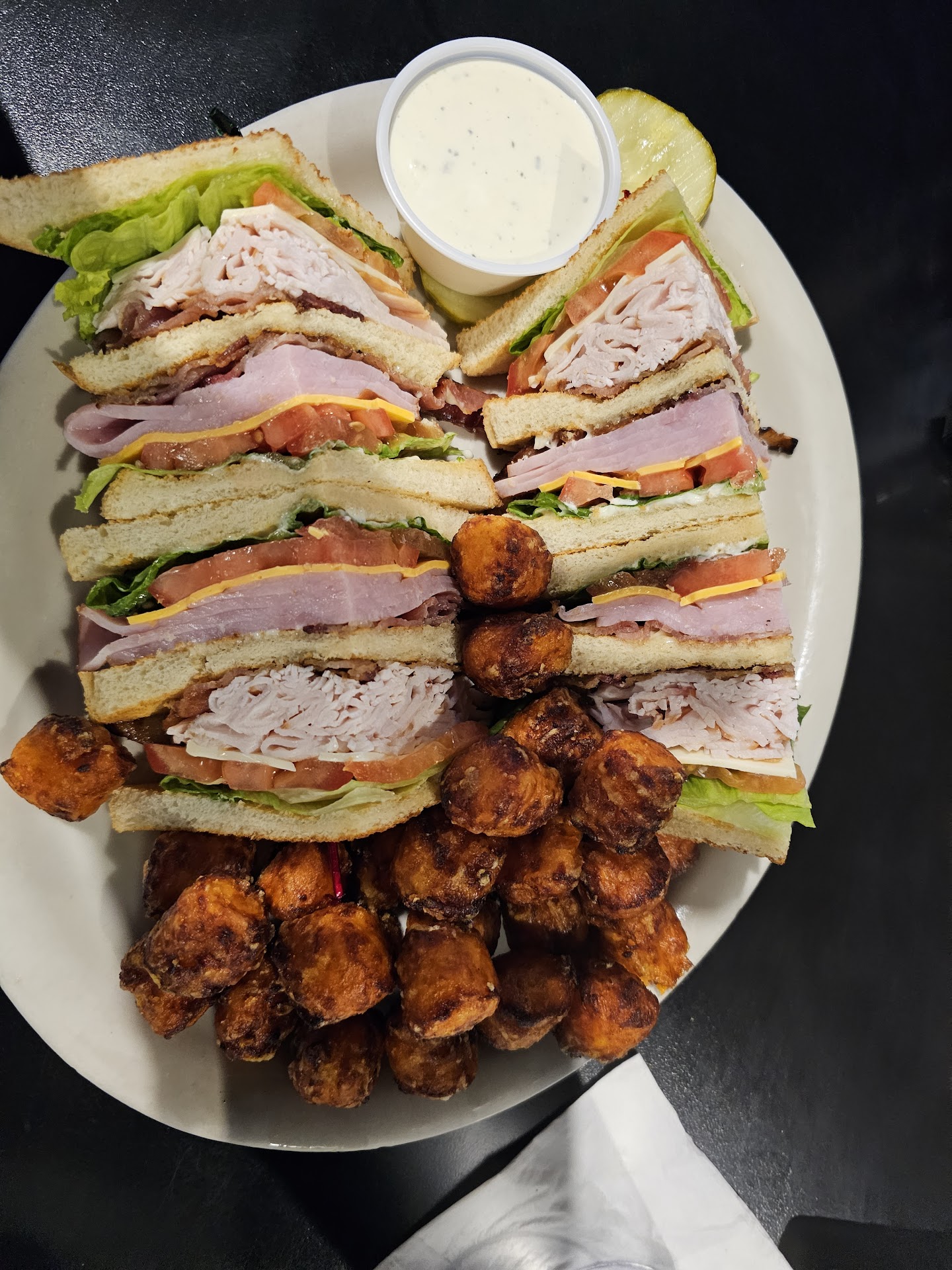 My club sandwich was fine but my sweet potato tots were delicious. Cooked just right. First time I have had them. My husband had roast beef dinner, which was very good. Veggies cooked just right. Portions were plentiful, and taste was great. I do recommend the lemon berry cake. Very moist, great flavor, and not super sweet.