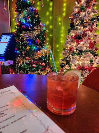 It was A Lot, rather impressive with the massive amounts of decorations. 2 page menu of appropriately named drinks. My husband was excited to order a Hot Chocolate Flight but I guess we got there too late and they were out 😢. Instead he had a gin drink Gingle All The Way. I had the tequila based Merrygarita.