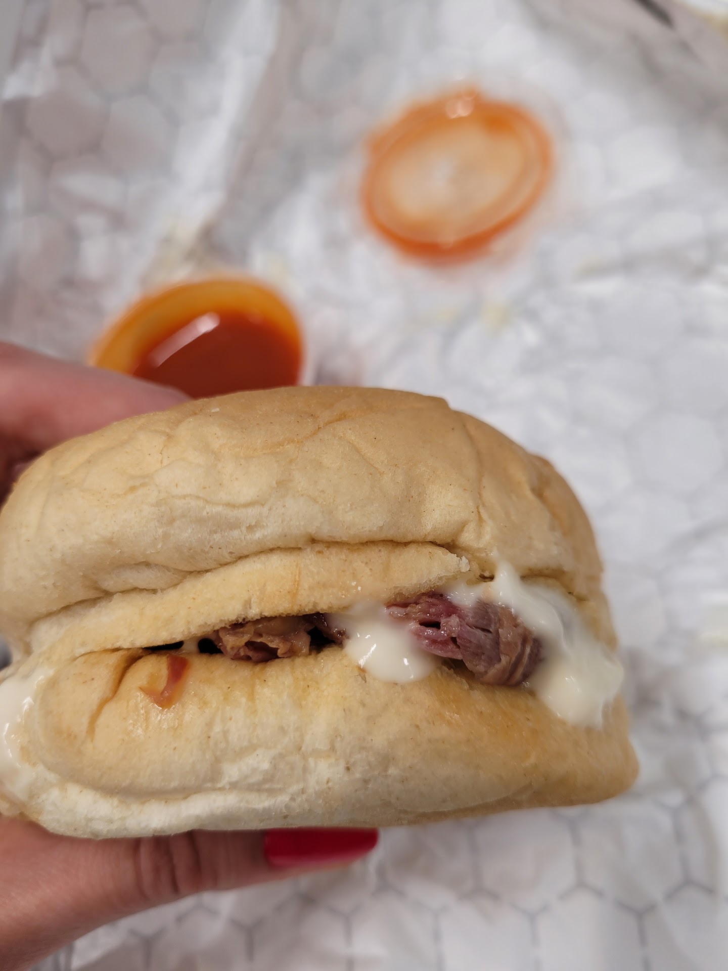 Why I liked the pork so much, it was smoked properly, not over smoked and there was little to no fat anywhere on the sandwich. I suspect they use pork loin instead of shoulder which is a little leaner. This is the way to go if you don't like chunks of fat in your sandwich, which I do not. Now I know many out there will say fat adds flavor, and they are not wrong, but to much fat makes it chewy. Myself, I like it a little less fatty and this was very lean and very tasty. The Sweet Chili sauce was very good, and so was the Hot Sauce
