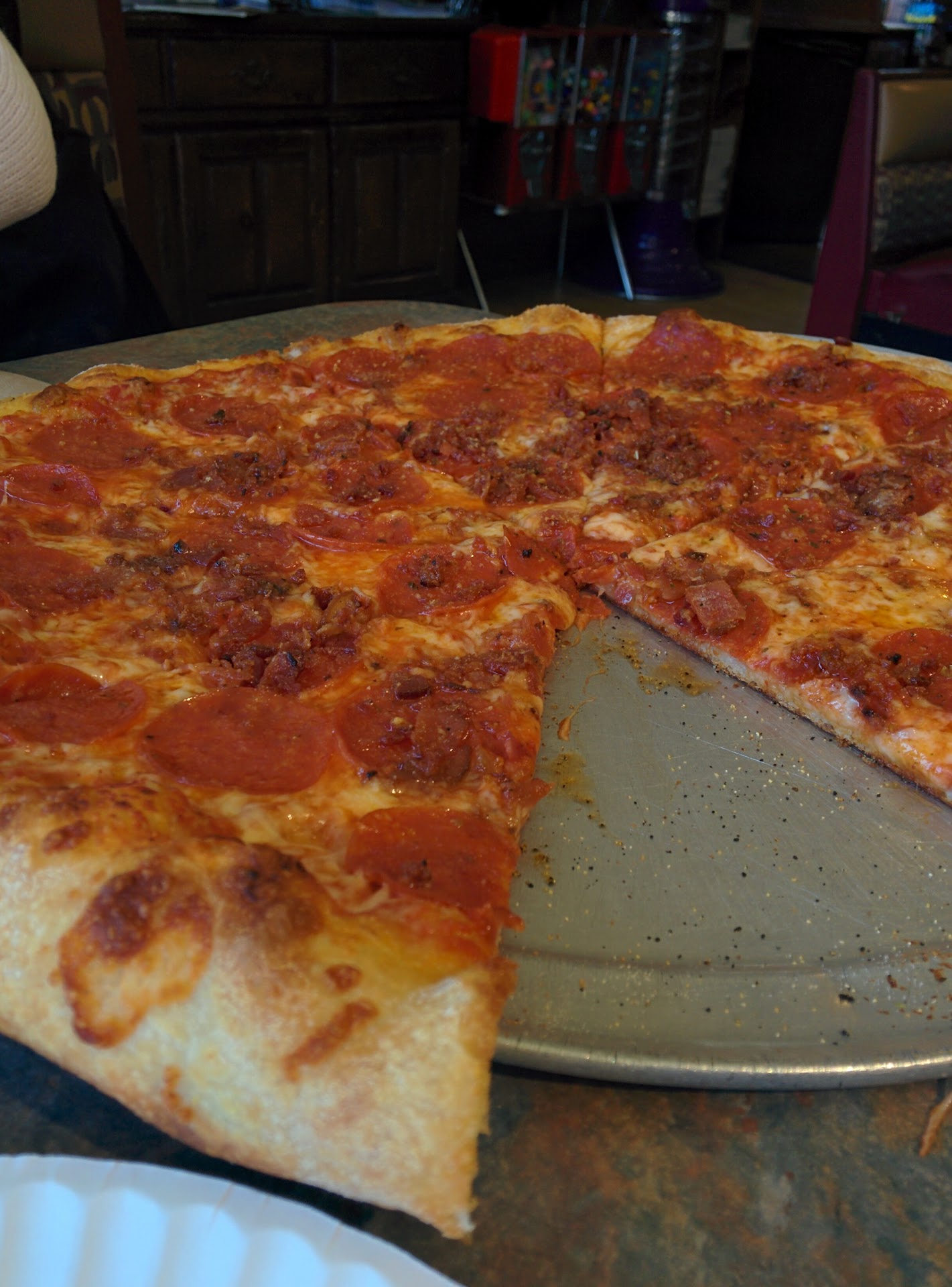 Read moreWhile not outstanding, this pizza was definitely a league above some other I've had in the past. Im not one who's easily disappointed by pizza nor food in general, however, while I was eating the pizza I ordered I did experience slight flaws. Not To make it seem like the pizza was bad in any capacity, I feel like it has potential to be great, unfortunately falling a little flat for my liking. If there were to be more options (crust, toppings, etc) I feel like we could have a very good authentic New York style pizzeria, but there was only one kind of crust and style to choose from. Admittedly, I was frankly disappointed by this, however this isnt inherently bad. The second flaw was the pizza was very greasy. Now I know im slightly nitpicking as pizza is notorious for being greasy, but I felt as though it took away from the eating experience as we already have a thin crust, this grease made it very soggy and limp. This goes without saying I enjoyed the pizza while eating it. I found the crust to be very good and one of the best crusts on a pizza I've ever had, but the let down was the under carriage. The service was good, I felt respected and treated kindly by the staff and the scenery was authentic. It made me feel like I was in a New York pizza place. I won't go on and on about how this pizza could have been improved, however I will give it this. It was a very okay pizza and for the flaws it had, it made me not hungry anymore, not quite full...