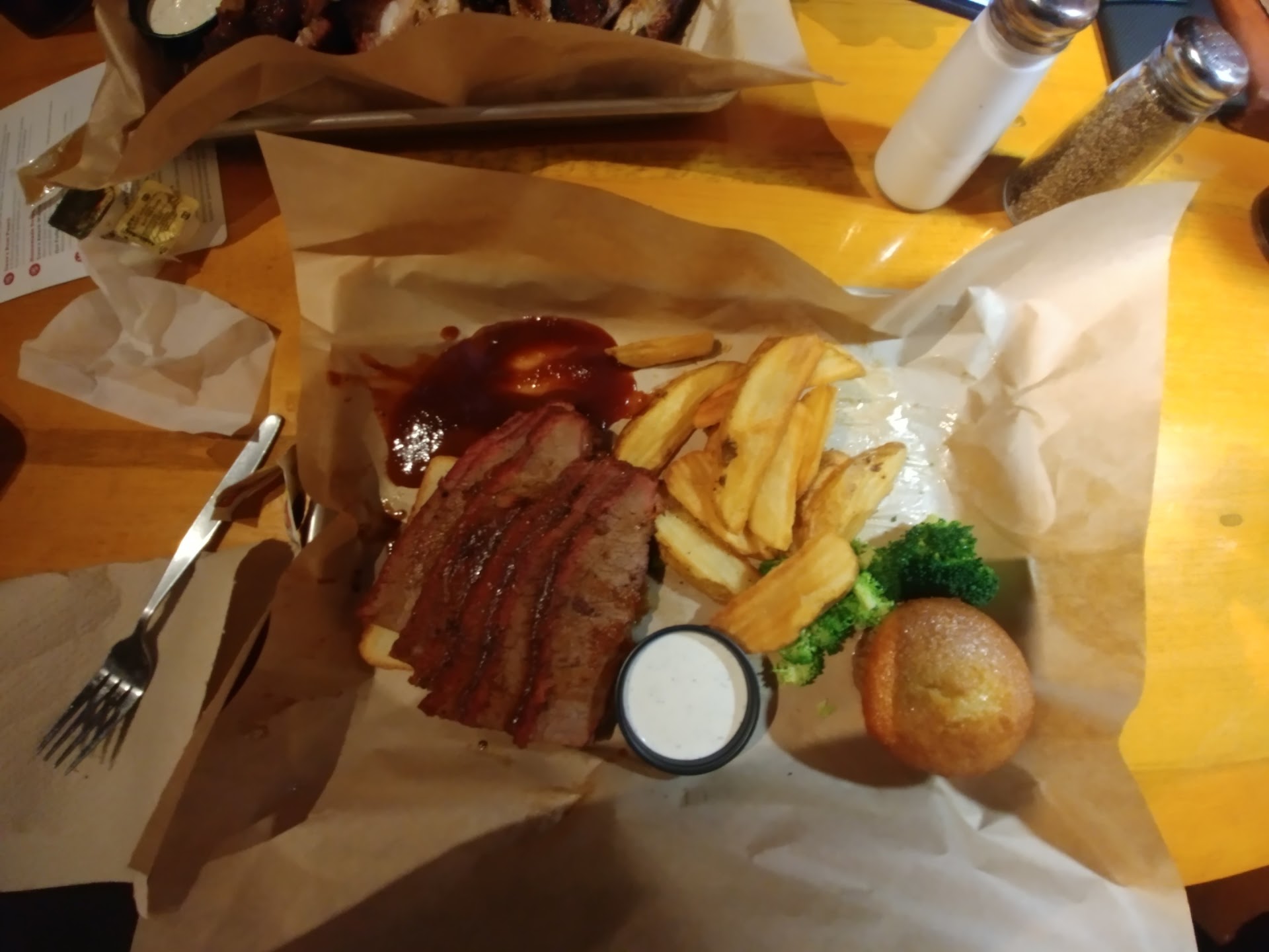 Read moreOne Saturday night, a group of five and I visited Famous Dave’s, an outlet of a barbecue chain serving wood-smoked meats and sides in an American West, themed restaurant. The restaurant was busy that evening, but that was to be expected as it was a warm Saturday night and its’ relative location to South Point Mall. Upon entering the restaurant, I noticed the cozy and comfortable atmosphere with the dim lighting, wooden walls, and the stone fireplace that was filling the back wall to make the restaurant feel homey. Inside the restaurant there were a variety of groups of people ranging from large groups to couples, toddlers and seniors. We were greeted by a friendly hostess with a smile, who politely led us to our circular table that was located near the wood-burning fireplace. After we sat down the hostess passed around the menus and told us that our waitress would be with us shortly. A few moments later the waitress emerged to our table and greeted us with her name and asked us what we would like to drink. As I can’t remember what type of drink products Famous Dave’s sells, I either ordered a Pepsi or a Coke. The waitress politely took our order and wrote it on her notepad and went off to go and prepare our drinks. While the waitress was gone we began to look inside the easy-to-read menu. Inside the menu Famous Dave’s has a range of foods ranging from salads to award-winning ribs. While it was difficult for me to choose what I was going to eat, I finally decided to order some buffalo wings with sides of grilled pineapple and Mac and Cheese. Each meal comes with a delicious, moist cornbread muffin. At the time, I had braces and eating wings was difficult for me to bite into. I decided that I would order boneless wings so I could still enjoy the taste of regular wings. Unfortunately, Famous Dave’s doesn’t have boneless wings on its menu. When the waitress came over to take our order I asked her if it was at all possible to make some boneless buffalo wings for me. Without hesitation, the waitress said that it was no problem for the cook to make them. About twenty minutes later, my food arrived in all of it’s glory. One at a time, the waitress handed us our platters and boy did it look delicious! All of us thoroughly enjoyed our meals. The flavor of the buffalo wings was perfect; they weren’t too hot and had a taste that just melted in your mouth. Not to mention, Famous Dave’s makes the best cornbread muffins and mac and cheese. The waitress came by multiple times to check up on us, making sure we didn’t need refills on either drinks or sauces. I can’t tell you how many times the waitress filled up my drink. My time at Famous Dave’s was very well spent for a nice and relaxing meal with friends. I would recommend Famous Dave’s to all different ages and groups of people. When comparing the food, staff, and atmosphere, I would rate Famous Dave’s a five...